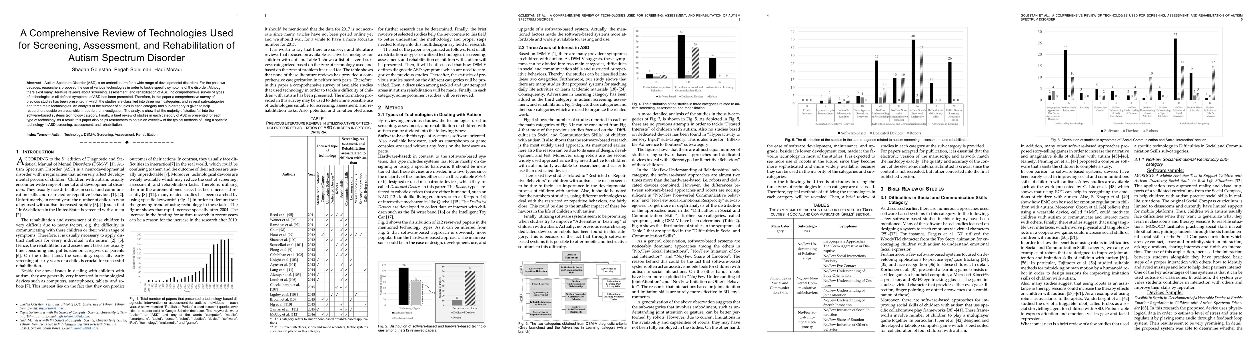 This paper provides a comprehensive review of technologies used for screening, assessment, and rehabilitation of Autism Spectrum Disorder (ASD), categorizing studies into three main technology types and analyzing their prevalence to identify areas for further research, with a focus on software-based systems.