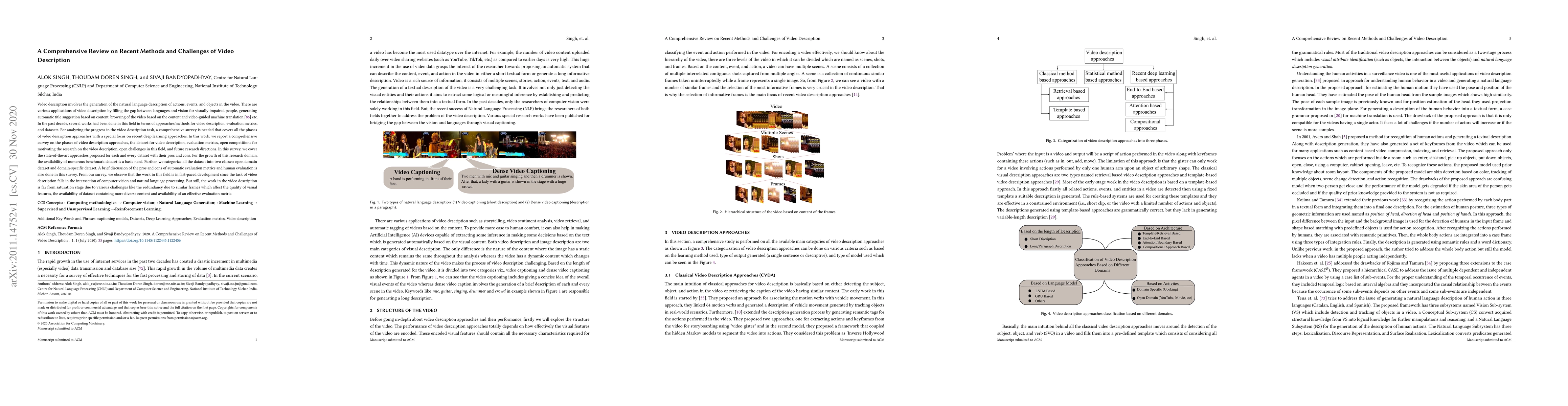 This paper provides a comprehensive review of recent methods and challenges in video description, focusing on deep learning approaches. It surveys state-of-the-art techniques, evaluation metrics, and datasets, highlighting the rapid development and ongoing challenges in the field, including redundancy in frames and the need for diverse datasets and effective evaluation metrics.