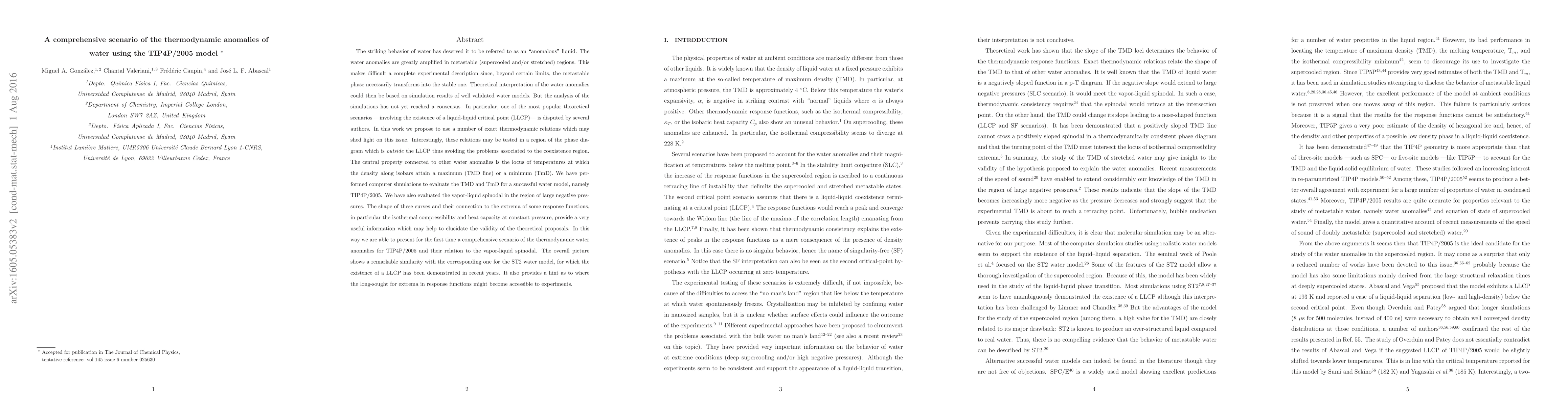 The striking behavior of water has deserved it to be referred to as an "anomalous" liquid. The water anomalies are greatly amplified in metastable (supercooled/stretched) regions. This makes difficult a complete experimental description since, beyond certain limits, the metastable phase necessarily transforms into the stable one. Theoretical interpretation of the water anomalies could then be based on simulation results of well validated water models. But the analysis of the simulations has not yet reached a consensus. In particular, one of the most popular theoretical scenarios -involving the existence of a liquid-liquid critical point (LLCP)- is disputed by several authors. In this work we propose to use a number of exact thermodynamic relations which can be tested in a region of the phase diagram outside the LLCP thus avoiding the problems associated to the coexistence region. The central property connected to other water anomalies is the locus of temperatures at which the density along isobars attain a maximum (TMD line) or a minimum (TmD), computed via simulations for a successful water model, TIP4P/2005. Next, we have evaluated the vapor-liquid spinodal in the region of large negative pressures. The shape of these curves and their connection to the extrema of response functions (isothermal compressibility and heat capacity at constant pressure) may help to elucidate the validity of the theoretical proposals. In this way we are able to present for the first time a comprehensive scenario of the thermodynamic water anomalies for TIP4P/2005 and their relation to the vapor-liquid spinodal. The overall picture shows a remarkable similarity with the corresponding one for the ST2 water model, for which the existence of a LLCP has been demonstrated in recent years. It also provides a hint as to where the long-sought for extrema in response functions might become accessible to experiments.