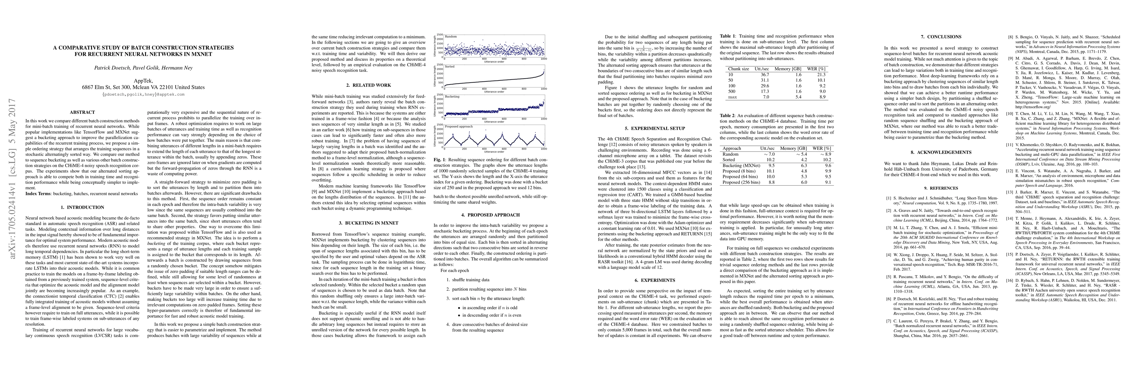 This paper compares various batch construction methods for training recurrent neural networks in MXNet, proposing a stochastic alternating sorting strategy that competes with bucketing in terms of training time and recognition performance, while being simpler to implement. Experiments on the CHiME-4 corpus demonstrate the effectiveness of the proposed method.