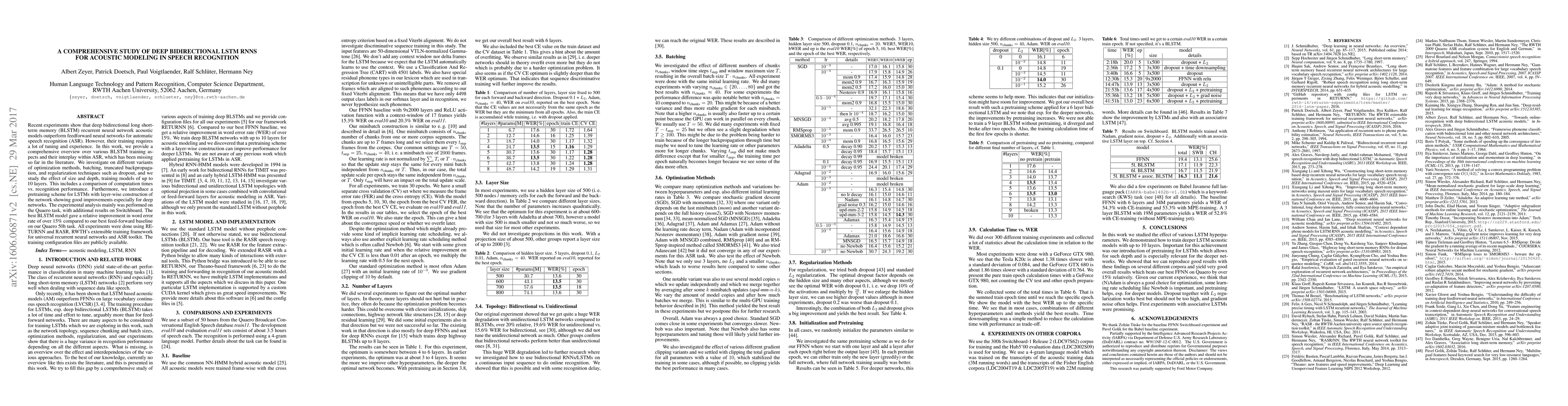 This paper investigates deep bidirectional LSTM RNNs for automatic speech recognition, finding that an 8-layer model achieves a 14% relative improvement in word error rate over feed-forward neural networks on the Quaero corpus. The study also explores various optimization and regularization techniques, and compares training times against performance.