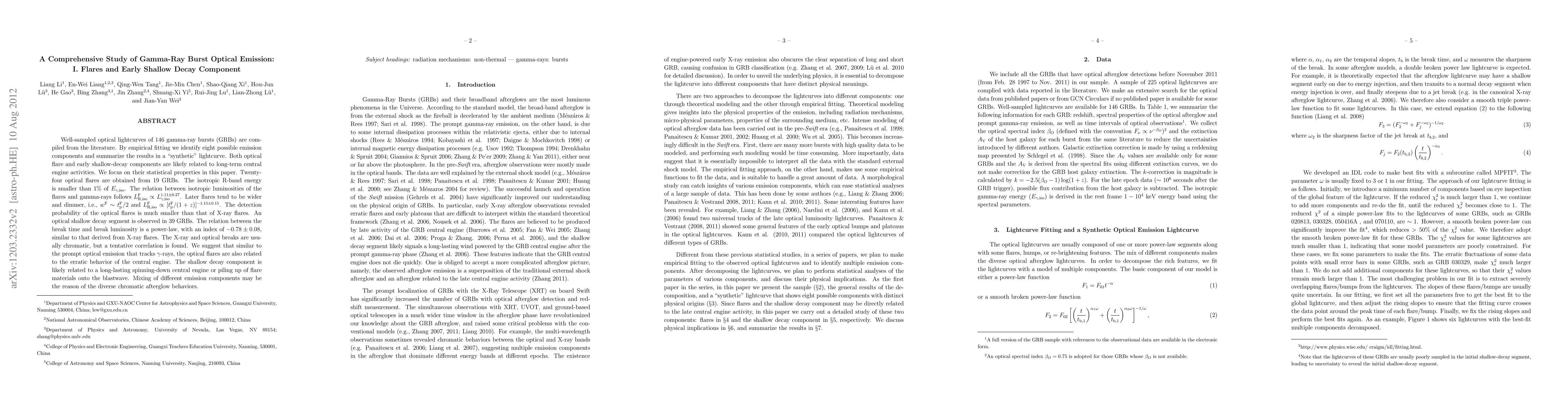 Well-sampled optical lightcurves of 146 gamma-ray bursts (GRBs) are compiled from the literature. By empirical fitting we identify eight possible emission components and summarize the results in a "synthetic" lightcurve. Both optical flare and early shallow-decay components are likely related to long-term central engine activities. We focus on their statistical properties in this paper. Twenty-four optical flares are obtained from 19 GRBs. The isotropic R-band energy is smaller than 1% of $E_{\gamma, \rm iso}$. The relation between isotropic luminosities of the flares and gamma-rays follows $L^{\rm F}_{\rm R, iso}\propto L_{{\gamma}, \rm iso}^{1.11\pm 0.27}$. Later flares tend to be wider and dimmer, i.e., $w^{\rm F}\sim t^{\rm F}_{\rm p}/2$ and $L^{\rm F}_{\rm R, iso}\propto [t^{\rm F}_{\rm p}/(1+z)]^{-1.15\pm0.15}$. The detection probability of the optical flares is much smaller than that of X-ray flares. An optical shallow decay segment is observed in 39 GRBs. The relation between the break time and break luminosity is a power-law, with an index of $-0.78\pm 0.08$, similar to that derived from X-ray flares. The X-ray and optical breaks are usually chromatic, but a tentative correlation is found. We suggest that similar to the prompt optical emission that tracks $\gamma$-rays, the optical flares are also related to the erratic behavior of the central engine. The shallow decay component is likely related to a long-lasting spinning-down central engine or piling up of flare materials onto the blastwave. Mixing of different emission components may be the reason of the diverse chromatic afterglow behaviors.