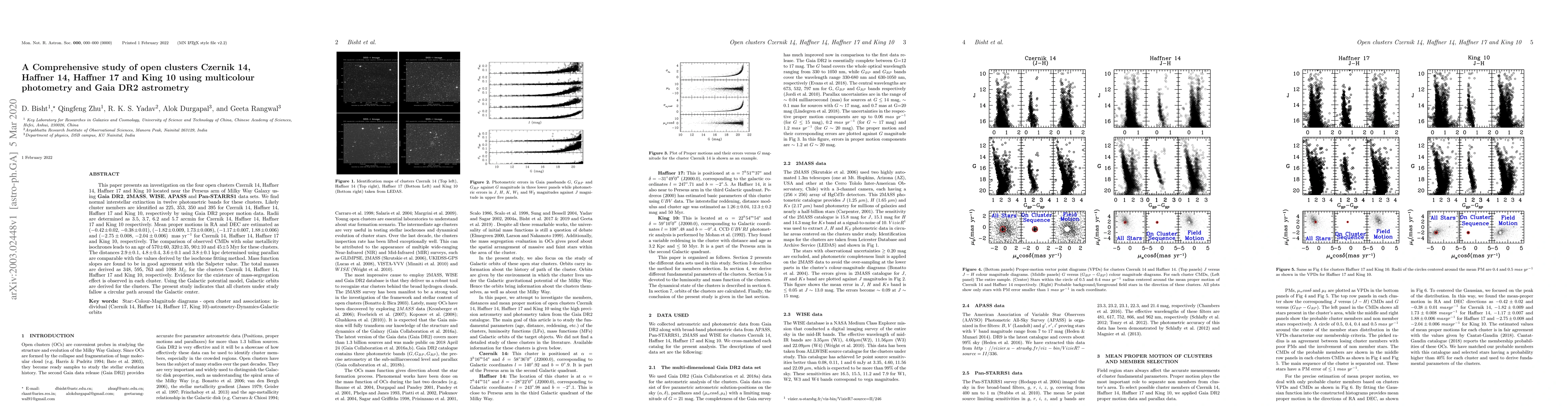 This paper presents an investigation on the four open clusters Czernik 14, Haffner 14, Haffner 17 and King 10 located near the Perseus arm of Milky Way Galaxy using Gaia DR2, 2MASS, WISE, APASS and Pan-STARRS1 data sets. We find normal interstellar extinction in twelve photometric bands for these clusters. Likely cluster members are identified as 225, 353, 350 and 395 for Czernik 14, Haffner 14, Haffner 17 and King 10, respectively by using Gaia DR2 proper motion data. Radii are determined as 3.5, 3.7, 6.2 and 5.7 arcmin for Czernik 14, Haffner 14, Haffner 17 and King 10 respectively. Mean proper motions in RA and DEC are estimated as (-0.42 \pm 0.02, -0.38 \pm 0.01), (-1.82 \pm 0.009, 1.73 \pm 0.008), (-1.17 \pm 0.007, 1.88 \pm 0.006) and (-2.75 \pm 0.008, -2.04 \pm 0.006) mas/yr for Czernik 14, Haffner 14, Haffner 17 and King 10, respectively. The comparison of observed CMDs with solar metallicity isochrones leads to an age of 570 \pm 60, 320 \pm 35, 90 \pm 10 and 45 \pm 5 Myr for these clusters. The distances 2.9 \pm 0.1, 4.8 \pm 0.4, 3.6 \pm 0.1 and 3.8 \pm 0.1 kpc determined using parallax are comparable with the values derived by the isochrone fitting method. Mass function slopes are found to be in good agreement with the Salpeter value. The total masses are derived as 348, 595, 763 and 1088 solar mass for the clusters Czernik 14, Haffner 14, Haffner 17 and King 10, respectively. Evidence for the existence of mass-segregation effect is observed in each cluster. Using the Galactic potential model, Galactic orbits are derived for the clusters. The present study indicates that all clusters under study fallow a circular path around the Galactic center.
