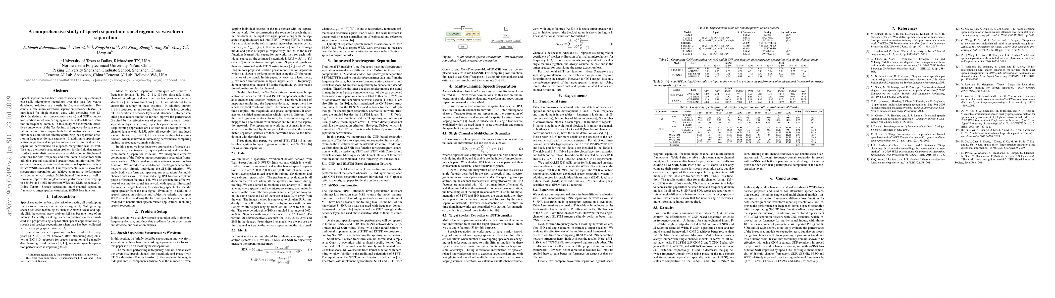Speech separation has been studied widely for single-channel close-talk microphone recordings over the past few years; developed solutions are mostly in frequency-domain. Recently, a raw audio waveform separation network (TasNet) is introduced for single-channel data, with achieving high Si-SNR (scale-invariant source-to-noise ratio) and SDR (source-to-distortion ratio) comparing against the state-of-the-art solution in frequency-domain. In this study, we incorporate effective components of the TasNet into a frequency-domain separation method. We compare both for alternative scenarios. We introduce a solution for directly optimizing the separation criterion in frequency-domain networks. In addition to speech separation objective and subjective measurements, we evaluate the separation performance on a speech recognition task as well. We study the speech separation problem for far-field data (more similar to naturalistic audio streams) and develop multi-channel solutions for both frequency and time-domain separators with utilizing spectral, spatial and speaker location information. For our experiments, we simulated multi-channel spatialized reverberate WSJ0-2mix dataset. Our experimental results show that spectrogram separation can achieve competitive performance with better network design. Multi-channel framework as well is shown to improve the single-channel performance relatively up to +35.5% and +46% in terms of WER and SDR, respectively.