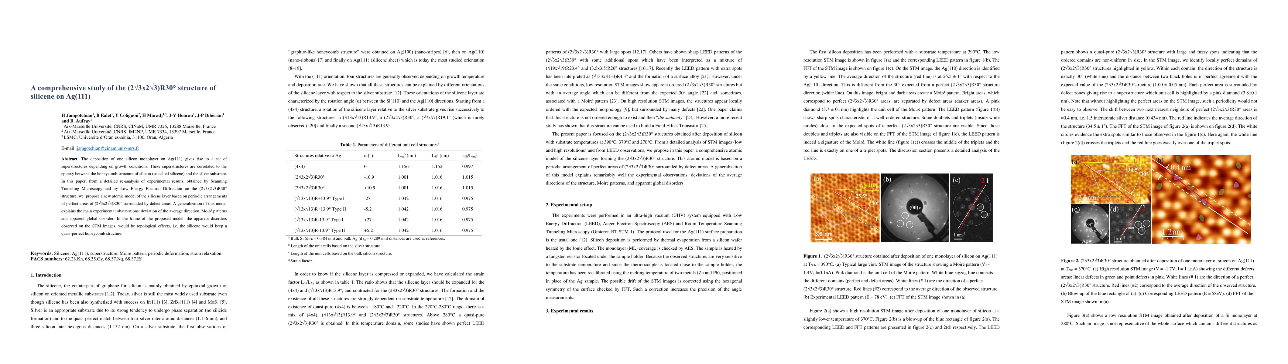 The deposition of one silicon monolayer on Ag(111) gives rise to a set of superstructures depending on growth conditions. These superstructures are correlated to the epitaxy between the honeycomb structure of silicon (so called silicene) and the silver substrate. In this paper, from a detailed re-analysis of experimental results, obtained by Scanning Tunneling Microscopy and by Low Energy Electron Diffraction on the (2R3x2R3)R30 structure, we propose a new atomic model of the silicene layer based on periodic arrangements of perfect areas of (2R3x2R3)R30 surrounded by defect areas. A generalization of this model explains the main experimental observations: deviation of the average direction, Moire patterns and apparent global disorder. In the frame of the proposed model, the apparent disorders observed on the STM images, would be topological effects, i.e. the silicene would keep a quasi-perfect honeycomb structure.