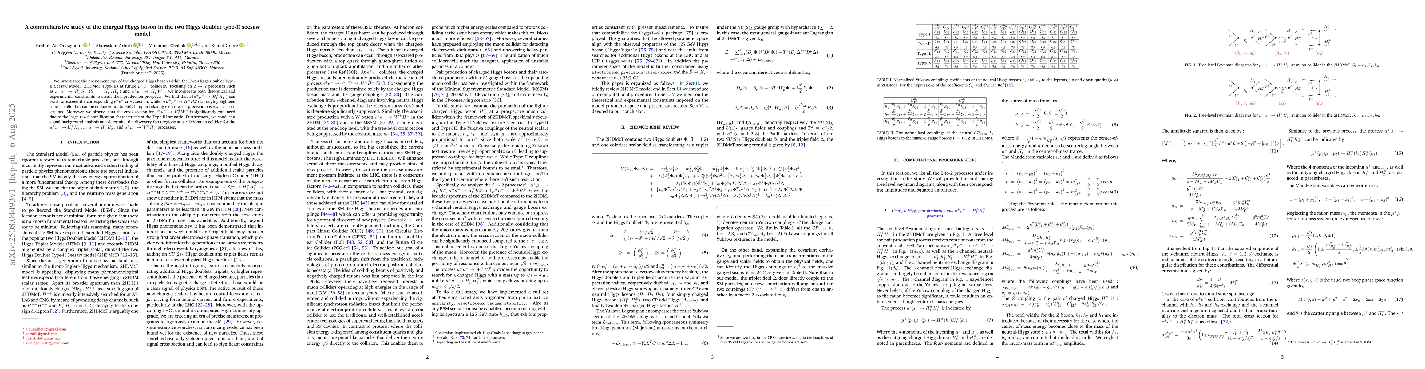 We investigate the phenomenology of the charged Higgs boson within the Two-Higgs-Doublet Type-II Seesaw Model (2HDMcT Type-III) at future $\mu^+ \mu^-$ colliders. Focusing on $2 \to 2$ processes such as $\mu^+ \mu^- \to H^+_1 S^-$ ($S^- = H^-_1, H^-_2$) and $\mu^+ \mu^- \to H^+_1 W^-$, we incorporate both theoretical and experimental constraints to assess their production prospects. We find that $\sigma(\mu^+ \mu^- \to H_1^+ H_1^-)$ can reach or exceed the corresponding $e^+ e^-$ cross section, while $\sigma(\mu^+ \mu^- \to H_1^+ H_2^-)$ is roughly eighteen times smaller but can be enhanced up to 0.62 fb upon relaxing electroweak precision observables constraints. Moreover, we observe that the cross section for $\mu^+ \mu^- \to H^+_1 W^-$ is significantly enhanced due to the large $\tan\beta$ amplification characteristic of the Type-III scenario. Furthermore, we conduct a signal-background analysis and determine the discovery ($5\sigma$) regions at a 3 TeV muon collider for the $\mu^+ \mu^- \to H_1^+ H_1^-$, $\mu^+ \mu^- \to H_1^+ H_2^-$, and $\mu^+ \mu^- \to W^\pm H_1^\mp$ processes.