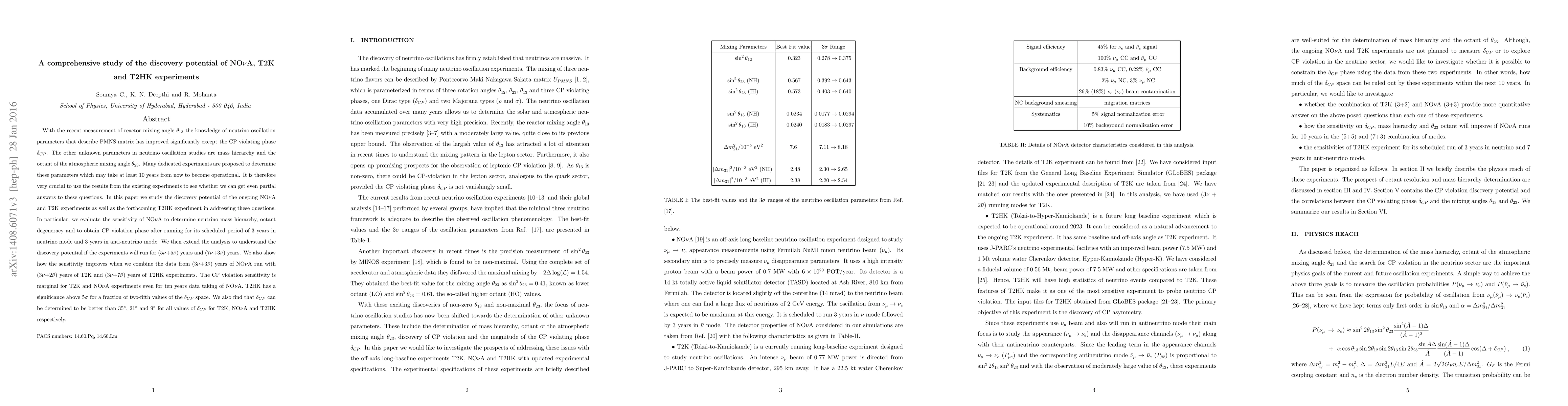With the recent measurement of reactor mixing angle $\theta_{13}$ the knowledge of neutrino oscillation parameters that describe PMNS matrix has improved significantly except the CP violating phase $\delta_{CP}$. The other unknown parameters in neutrino oscillation studies are mass hierarchy and the octant of the atmospheric mixing angle $\theta_{23}$. Many dedicated experiments are proposed to determine these parameters which may take at least 10 years from now to become operational. It is therefore very crucial to use the results from the existing experiments to see whether we can get even partial answers to these questions. In this paper we study the discovery potential of the ongoing NO$\nu$A and T2K experiments as well as the forthcoming T2HK experiment in addressing these questions. In particular, we evaluate the sensitivity of NO$\nu$A to determine neutrino mass hierarchy, octant degeneracy and to obtain CP violation phase after running for its scheduled period of 3 years in neutrino mode and 3 years in anti-neutrino mode. We then extend the analysis to understand the discovery potential if the experiments will run for (5$\nu$+5$\bar{\nu}$) years and (7$\nu$+3$\bar{\nu}$) years. We also show how the sensitivity improves when we combine the data from (3$\nu$+3$\bar{\nu}$) years of NO$\nu$A run with (3$\nu$+2$\bar{\nu}$) years of T2K and (3$\nu$+7$\bar{\nu}$) years of T2HK experiments. The CP violation sensitivity is marginal for T2K and NO$\nu$A experiments even for ten years data taking of NO$\nu$A. T2HK has a significance above 5$\sigma$ for a fraction of two-fifth values of the $\delta_{CP}$ space. We also find that $\delta_{CP}$ can be determined to be better than $35^\circ $, $21^\circ $ and $9^\circ $ for all values of $\delta_{CP}$ for T2K, NO$\nu$A and T2HK respectively.
