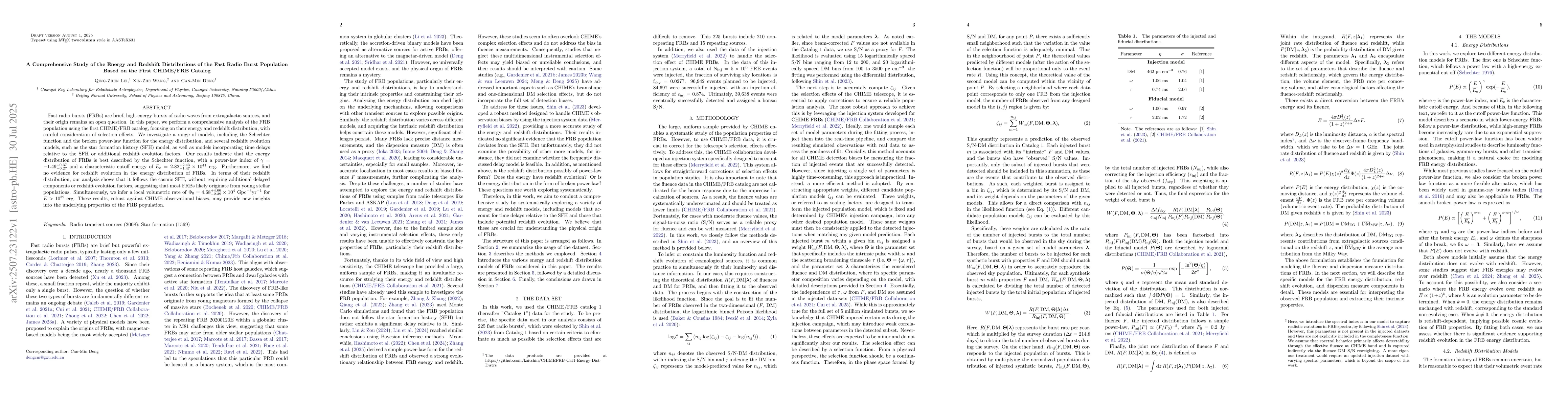 Fast radio bursts (FRBs) are brief, high-energy bursts of radio waves from extragalactic sources, and their origin remains an open question. In this paper, we perform a comprehensive analysis of the FRB population using the first CHIME/FRB catalog, focusing on their energy and redshift distribution, with careful consideration of selection effects. We investigate a range of models, including the Schechter function and the broken power-law function for the energy distribution, and several redshift evolution models, such as the star formation history (SFH) model, as well as models incorporating time delays relative to the SFH or additional redshift evolution factors. Our results indicate that the energy distribution of FRBs is best described by the Schechter function, with a power-law index of $\gamma = -1.49^{+0.37}_{-0.27}$ and a characteristic cutoff energy of $E_\mathrm{c} = 2.82^{+2.43}_{-1.47} \times 10^{41}$ erg. Furthermore, we find no evidence for redshift evolution in the energy distribution of FRBs. In terms of their redshift distribution, our analysis shows that it follows the cosmic SFH, without requiring additional delayed components or redshift evolution factors, suggesting that most FRBs likely originate from young stellar populations. Simultaneously, we infer a local volumetric rate of $\Phi_0 = 4.68^{+4.66}_{-2.39} \times 10^{4} \rm \ Gpc^{-3}yr^{-1}$ for $E>10^{39}$ erg. These results, robust against CHIME observational biases, may provide new insights into the underlying properties of the FRB population.