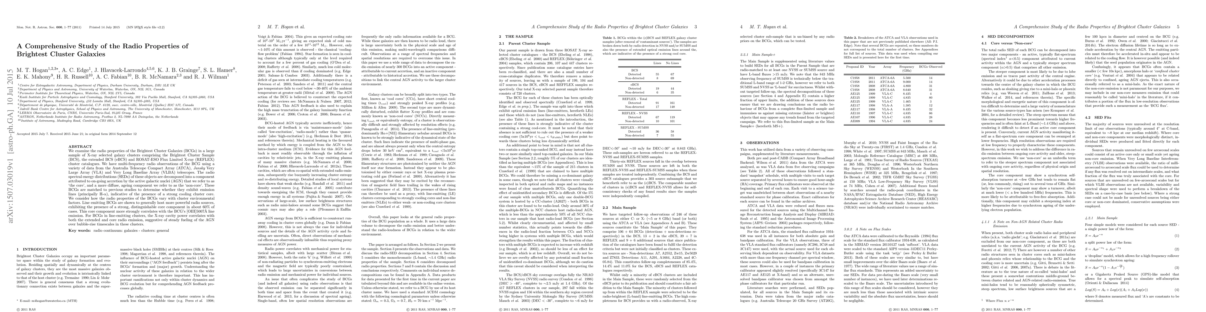 We examine the radio properties of the Brightest Cluster Galaxies (BCGs) in a large sample of X-ray selected galaxy clusters comprising the Brightest Cluster Sample (BCS), the extended BCS (eBCS) and ROSAT-ESO Flux Limited X-ray (REFLEX) cluster catalogues. We have multi-frequency radio observations of the BCG using a variety of data from the Australia Telescope Compact Array (ATCA), Jansky Very Large Array (VLA) and Very Long Baseline Array (VLBA) telescopes. The radio spectral energy distributions (SEDs) of these objects are decomposed into a component attributed to on-going accretion by the active galactic nuclei (AGN) that we refer to as the 'core', and a more diffuse, ageing component we refer to as the 'non-core'. These BCGs are matched to previous studies to determine whether they exhibit emission lines (principally H-alpha), indicative of the presence of a strong cooling cluster core. We consider how the radio properties of the BCGs vary with cluster environmental factors. Line emitting BCGs are shown to generally host more powerful radio sources, exhibiting the presence of a strong, distinguishable core component in about 60% of cases. This core component more strongly correlates with the BCG's [OIII]5007A line emission. For BCGs in line-emitting clusters, the X-ray cavity power correlates with both the extended and core radio emission, suggestive of steady fuelling of the AGN over bubble-rise time-scales in these clusters.