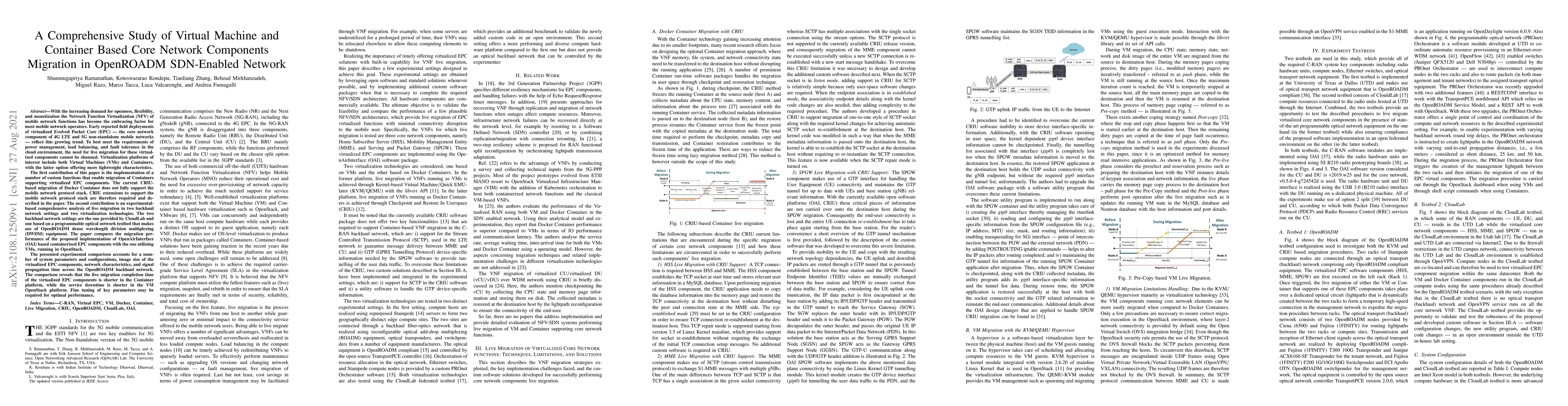 This paper implements custom functions for migrating containerized virtualized Evolved Packet Core (EPC) components in OpenROADM SDN-enabled networks, extending CRIU to support mobile network protocols. It conducts an experimental analysis comparing the performance of live migration between containerized and VM-based EPC components across two backhaul network settings, assessing various system parameters and network characteristics.