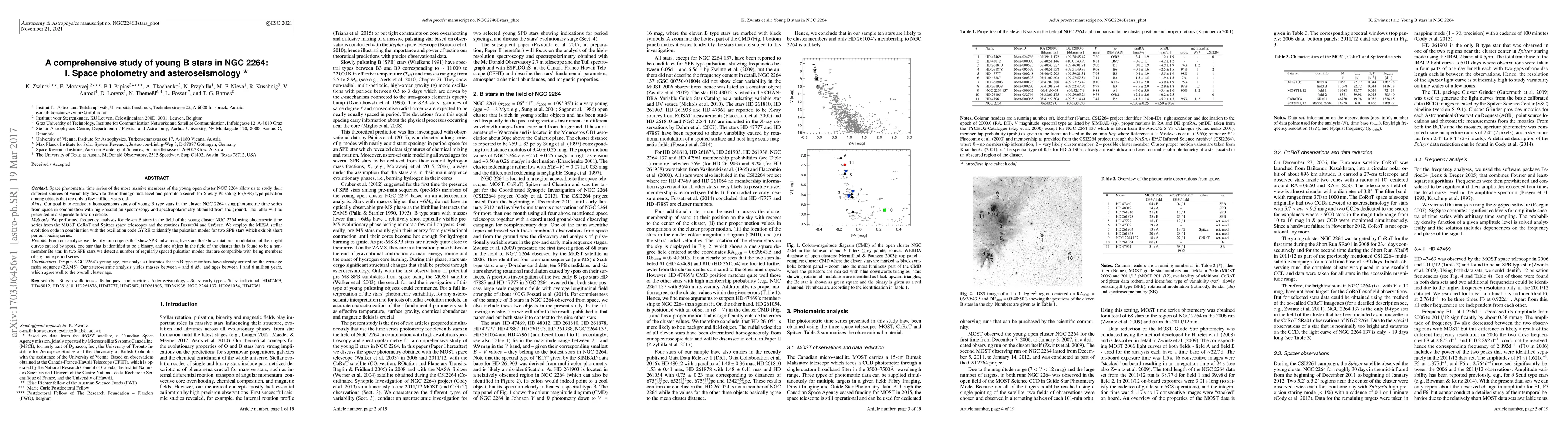 Space photometric time series of the most massive members of the young open cluster NGC 2264 allow us to study their different sources of variability down to the millimagnitude level and permits a search for Slowly Pulsating B (SPB) type pulsation among objects that are only a few million years old. Our goal is to conduct a homogeneous study of young B type stars in the cluster NGC 2264 using photometric time series from space in combination with high-resolution spectroscopy and spectropolarimetry obtained from the ground. The latter will be presented in a separate follow-up article. We performed frequency analyses for eleven B stars in the field of the young cluster NGC 2264 using photometric time series from the MOST, CoRoT and Spitzer space telescopes and the routines Period04 and SigSpec. We employ the MESA stellar evolution code in combination with the oscillation code GYRE to identify the pulsation modes for two SPB stars which exhibit short period spacing series. From our analysis we identify four objects that show SPB pulsations, five stars that show rotational modulation of their light curves caused by spots, one star that is identified to be a binary, and one object in the field of the cluster that is found to be a non-member Be star. In two SPB stars we detect a number of regularly spaced pulsation modes that are compatible with being members of a g mode period series. Despite NGC 2264's young age, our analysis illustrates that its B type members have already arrived on the zero-age main sequence (ZAMS). Our asteroseismic analysis yields masses between 4 and 6 Msun and ages between 1 and 6 million years, which agree well to the overall cluster age.
