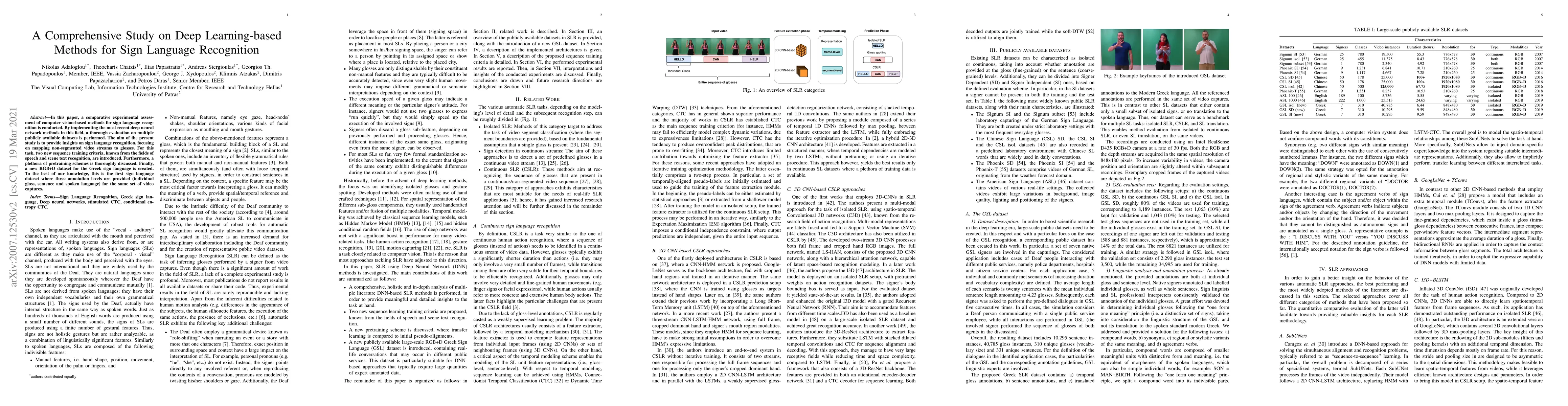 This paper evaluates recent deep learning methods for sign language recognition, introducing new sequence training criteria and discussing various pretraining schemes. It also creates a new RGB+D dataset for Greek sign language with sentence and gloss level annotations, aiming to advance the field.
