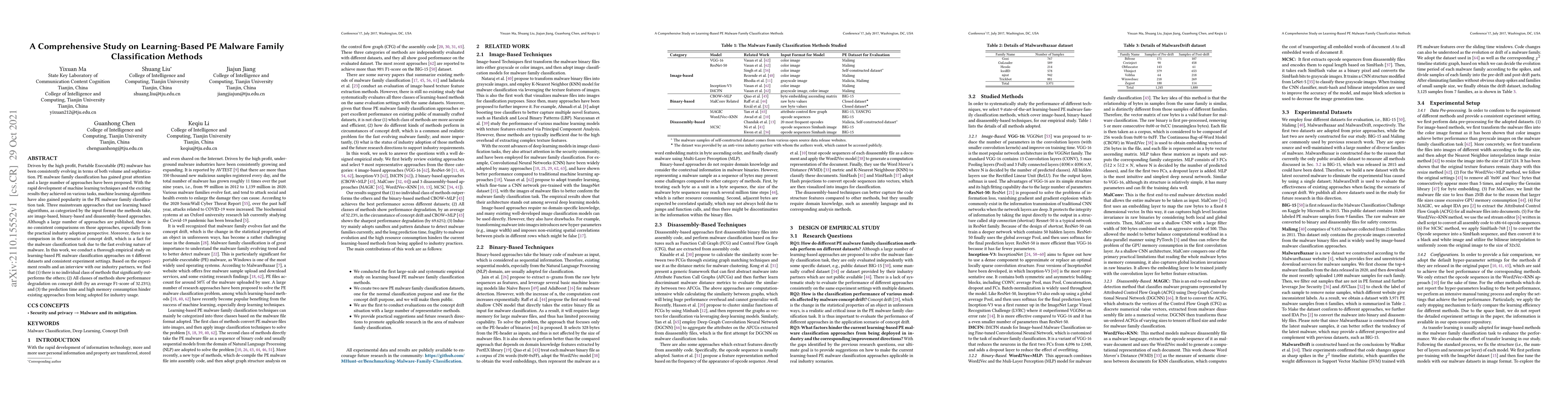 Driven by the high profit, Portable Executable (PE) malware has been consistently evolving in terms of both volume and sophistication. PE malware family classification has gained great attention and a large number of approaches have been proposed. With the rapid development of machine learning techniques and the exciting results they achieved on various tasks, machine learning algorithms have also gained popularity in the PE malware family classification task. Three mainstream approaches that use learning based algorithms, as categorized by the input format the methods take, are image-based, binary-based and disassembly-based approaches. Although a large number of approaches are published, there is no consistent comparisons on those approaches, especially from the practical industry adoption perspective. Moreover, there is no comparison in the scenario of concept drift, which is a fact for the malware classification task due to the fast evolving nature of malware. In this work, we conduct a thorough empirical study on learning-based PE malware classification approaches on 4 different datasets and consistent experiment settings. Based on the experiment results and an interview with our industry partners, we find that (1) there is no individual class of methods that significantly outperforms the others; (2) All classes of methods show performance degradation on concept drift (by an average F1-score of 32.23%); and (3) the prediction time and high memory consumption hinder existing approaches from being adopted for industry usage.