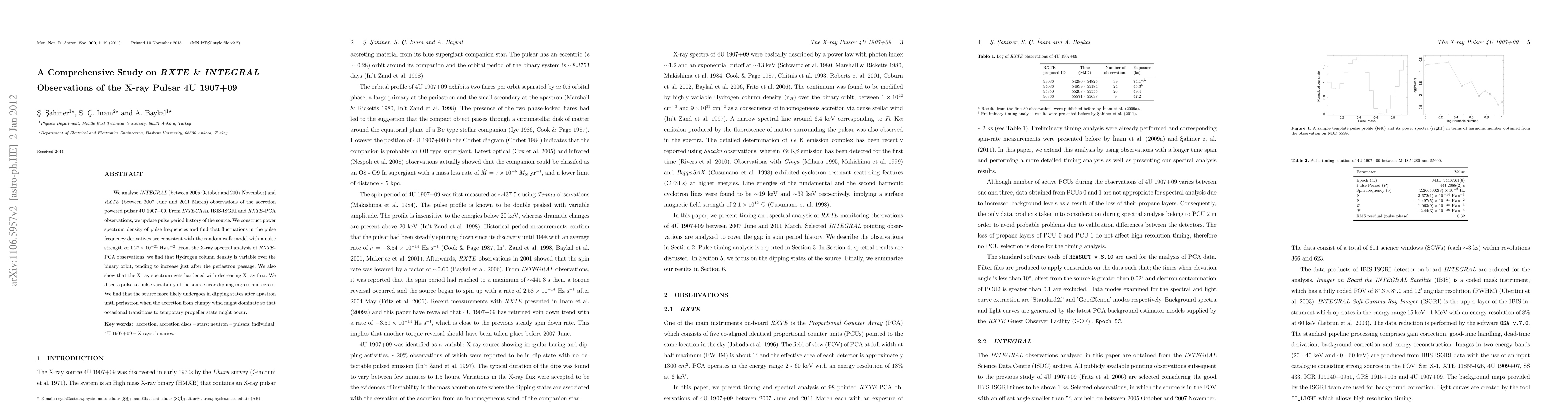 Researchers analyzed X-ray observations of pulsar 4U 1907+09 from INTEGRAL and RXTE telescopes, finding variable hydrogen column density and pulse frequency fluctuations consistent with a random walk model.
