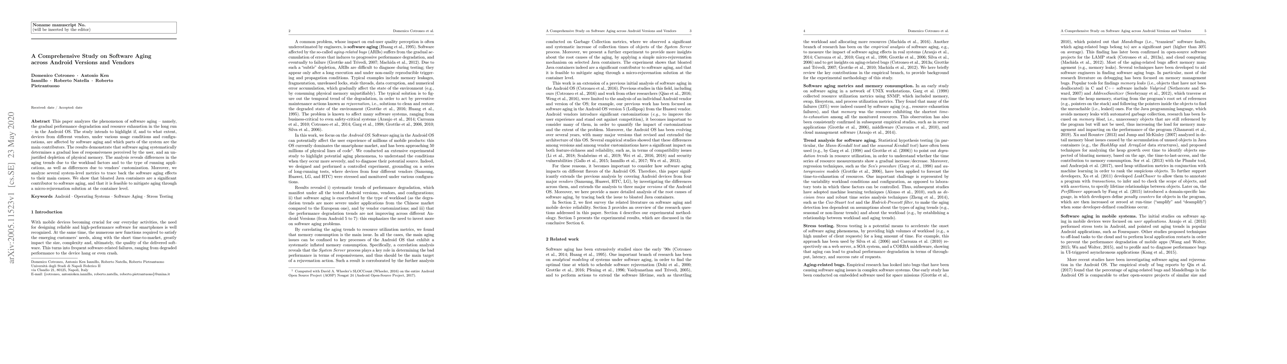 This paper investigates software aging in Android OS, showing performance degradation and resource exhaustion over time. It finds that aging affects devices differently based on vendor customizations and usage conditions, with bloated Java containers identified as major contributors, and proposes a micro-rejuvenation solution to mitigate it.