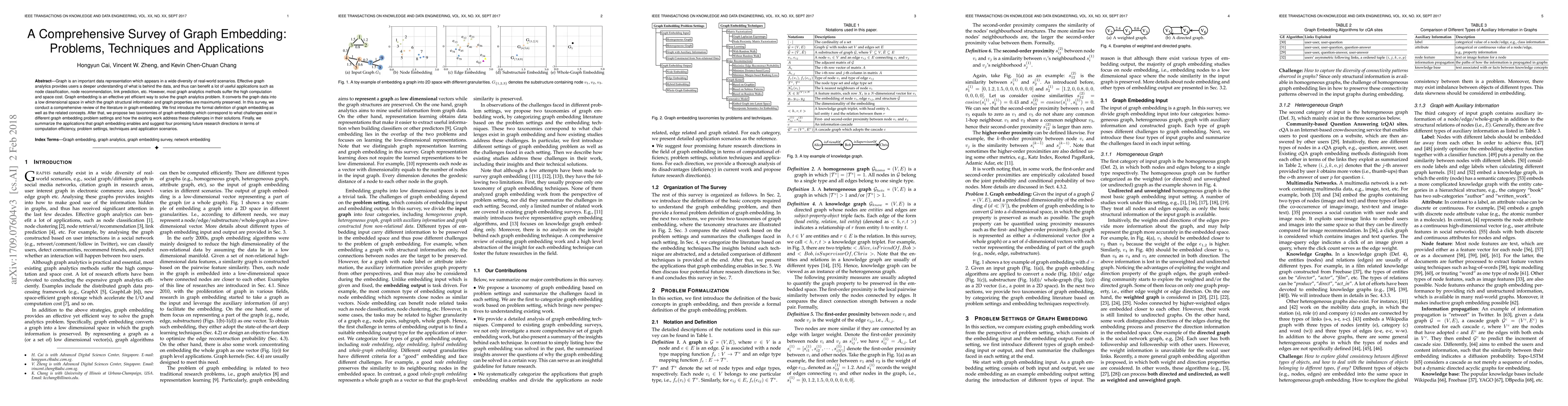 This paper provides a comprehensive survey of graph embedding techniques, addressing challenges in graph analytics and summarizing methods to convert graph data into low-dimensional representations while preserving structural information. It proposes taxonomies of graph embedding and outlines applications and future research directions.