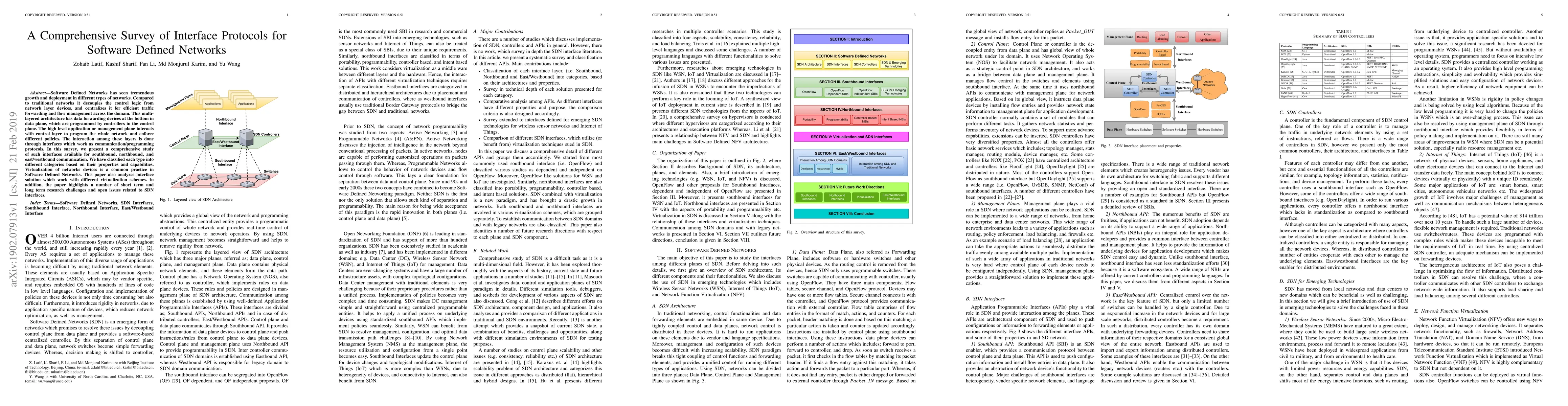 This paper provides a comprehensive survey of the various interface protocols used in Software Defined Networks (SDN), categorizing them based on their properties and capabilities for southbound, northbound, and east/westbound communication. It also discusses challenges and open issues in SDN interface solutions, particularly in the context of network device virtualization.