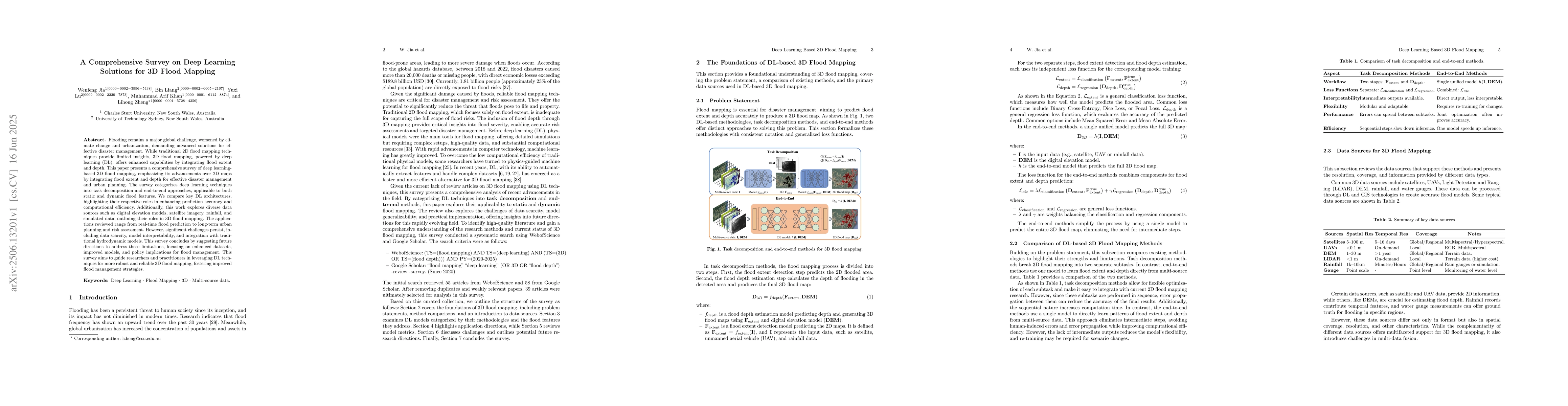 Flooding remains a major global challenge, worsened by climate change and urbanization, demanding advanced solutions for effective disaster management. While traditional 2D flood mapping techniques provide limited insights, 3D flood mapping, powered by deep learning (DL), offers enhanced capabilities by integrating flood extent and depth. This paper presents a comprehensive survey of deep learning-based 3D flood mapping, emphasizing its advancements over 2D maps by integrating flood extent and depth for effective disaster management and urban planning. The survey categorizes deep learning techniques into task decomposition and end-to-end approaches, applicable to both static and dynamic flood features. We compare key DL architectures, highlighting their respective roles in enhancing prediction accuracy and computational efficiency. Additionally, this work explores diverse data sources such as digital elevation models, satellite imagery, rainfall, and simulated data, outlining their roles in 3D flood mapping. The applications reviewed range from real-time flood prediction to long-term urban planning and risk assessment. However, significant challenges persist, including data scarcity, model interpretability, and integration with traditional hydrodynamic models. This survey concludes by suggesting future directions to address these limitations, focusing on enhanced datasets, improved models, and policy implications for flood management. This survey aims to guide researchers and practitioners in leveraging DL techniques for more robust and reliable 3D flood mapping, fostering improved flood management strategies.