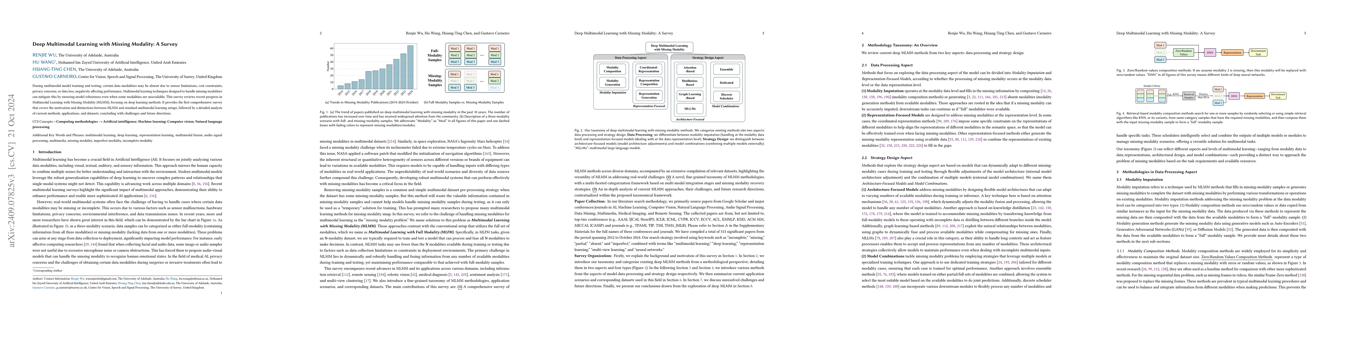 This survey reviews recent advancements in Deep Multimodal Learning with Missing Modality (MLMM), highlighting techniques to address data samples lacking certain modalities. It contrasts MLMM with standard multimodal learning and discusses current methods, applications, and datasets, concluding with challenges and future directions.