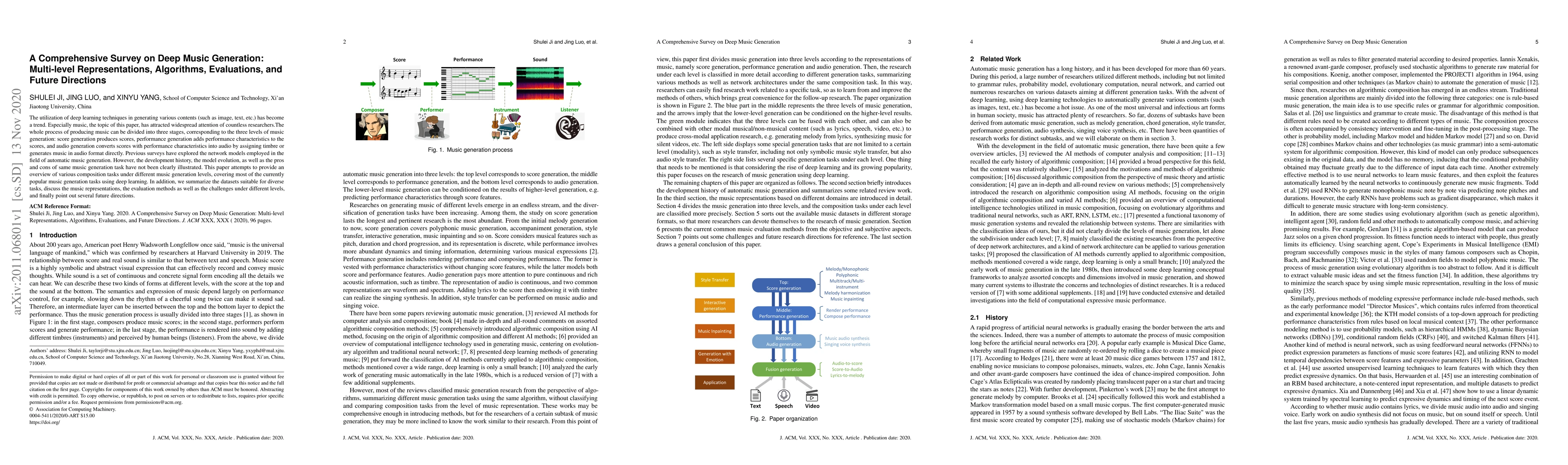 This paper provides a comprehensive survey on deep music generation techniques, detailing the evolution of algorithms across score, performance, and audio generation levels. It discusses evaluation methods, datasets, and challenges, and outlines future research directions.