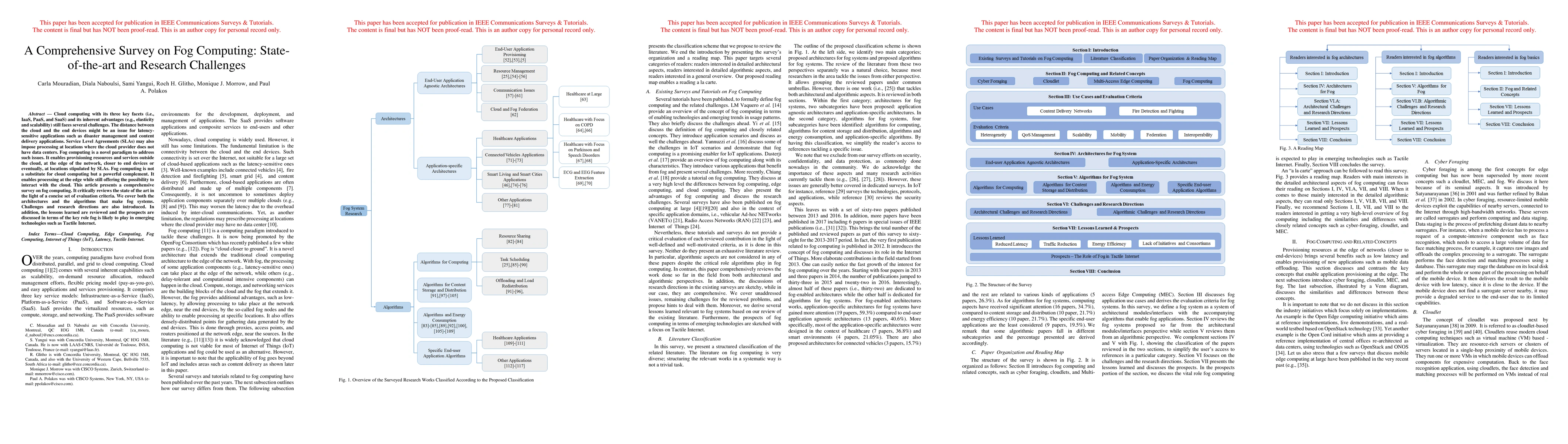 This paper provides a comprehensive survey on fog computing, highlighting its role as a complement to cloud computing by addressing latency issues and enabling edge-based processing. It reviews current architectures, algorithms, challenges, and future research directions, emphasizing fog computing's potential in emerging technologies like the Tactile Internet.