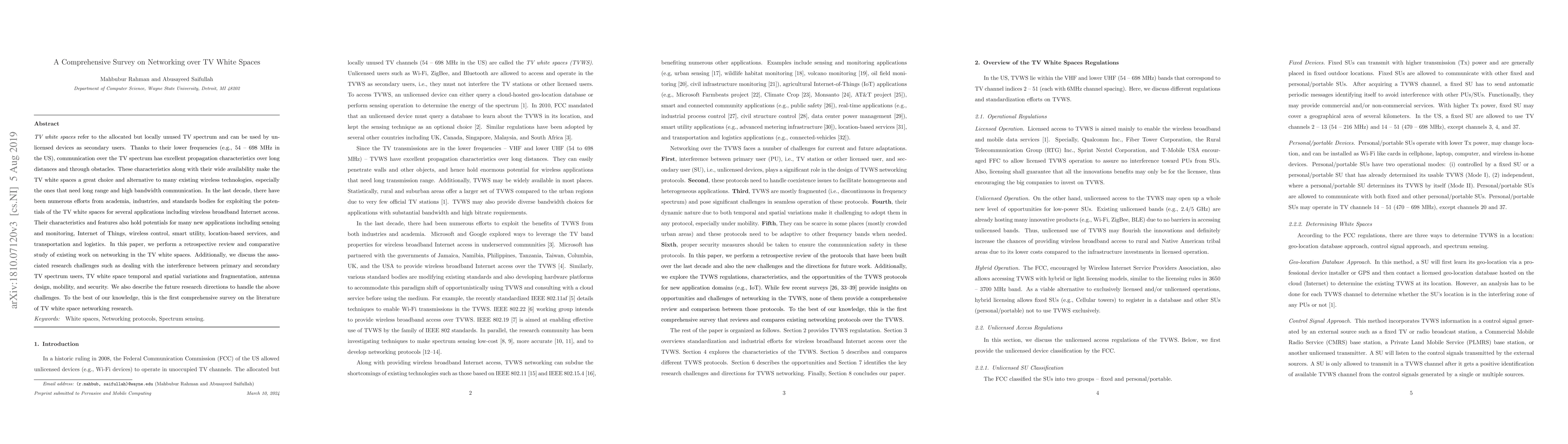 This paper provides a comprehensive survey on networking over TV white spaces, highlighting their potential for long-range, high-bandwidth communication. It reviews existing research, discusses challenges like interference and mobility, and outlines future research directions to address these issues.