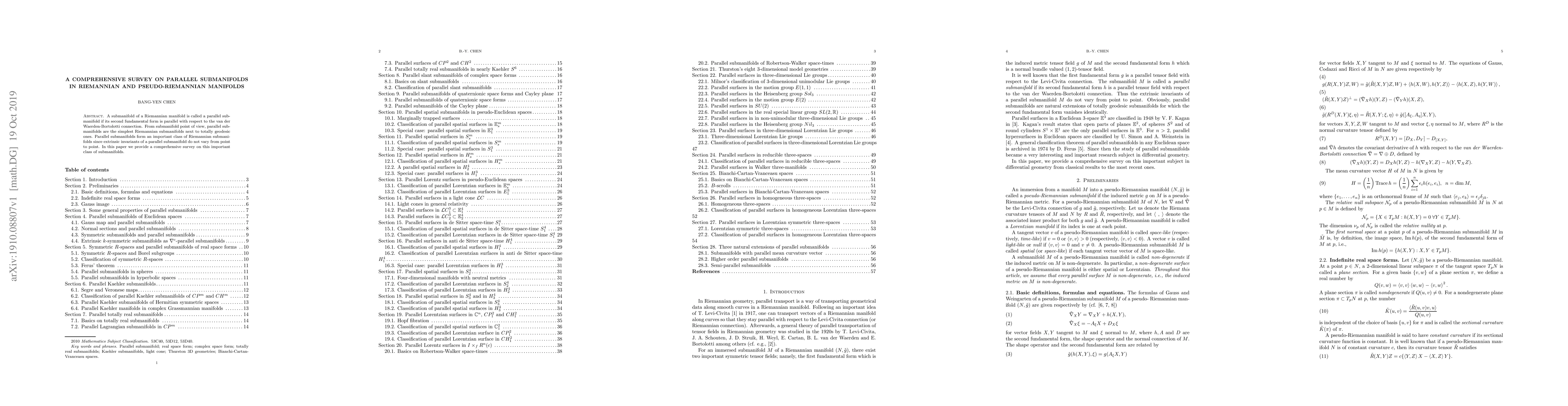 This paper offers a thorough survey on parallel submanifolds in Riemannian and pseudo-Riemannian manifolds, focusing on their definition, properties, and significance as a simple yet important class of submanifolds where extrinsic invariants remain constant.