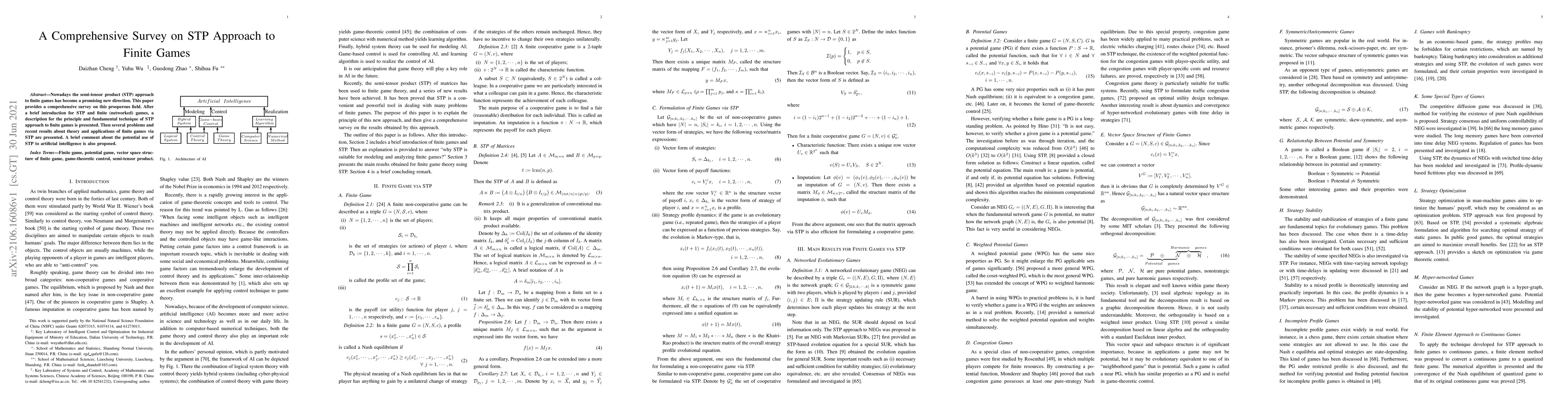 This paper offers a thorough survey of the semi-tensor product (STP) approach to finite games, detailing its principles and techniques. It also discusses recent theoretical advancements and applications, along with potential extensions to artificial intelligence.