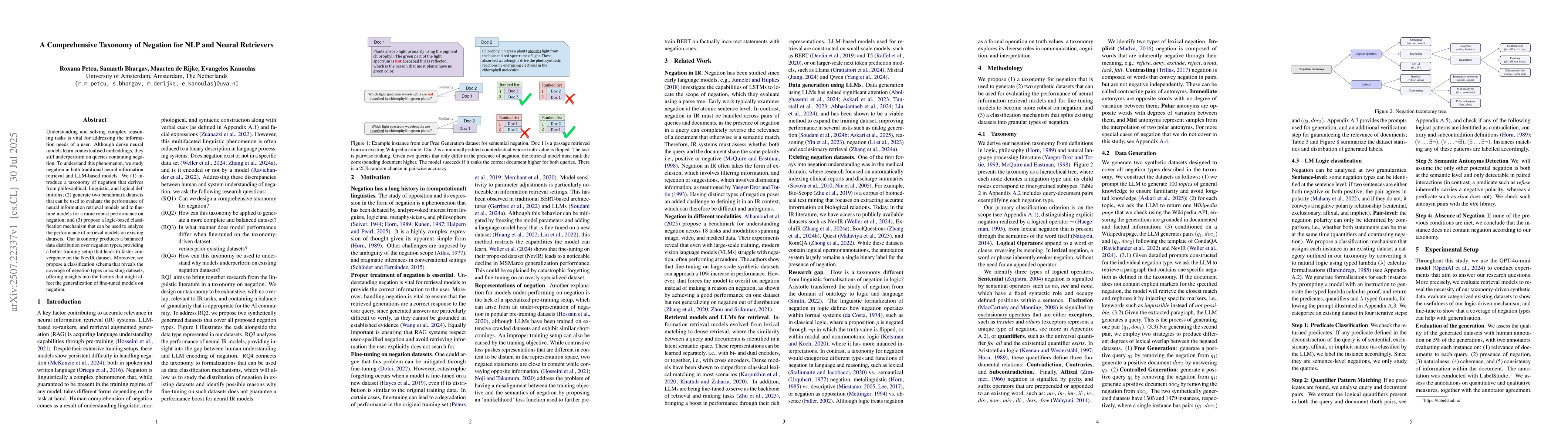 A taxonomy, benchmark datasets, and a logic-based classification mechanism for negation analysis in NLP and neural retrievers.