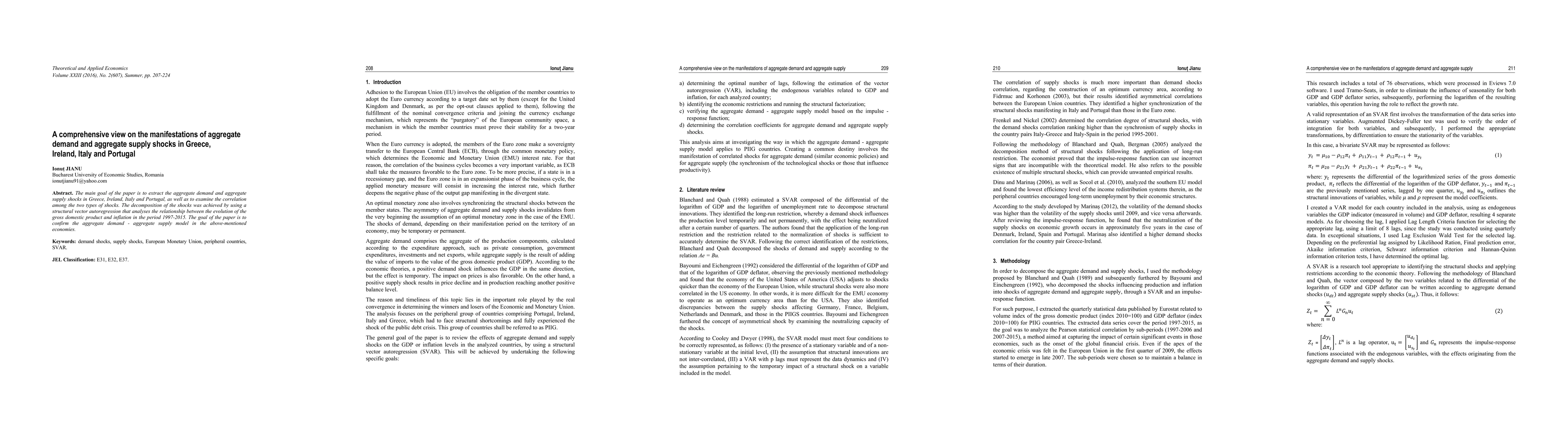 This paper uses structural vector autoregression to analyze GDP and inflation data from 1997-2015 in Greece, Ireland, Italy, and Portugal to identify and correlate aggregate demand and supply shocks, aiming to validate the aggregate demand-aggregate supply model in these economies.