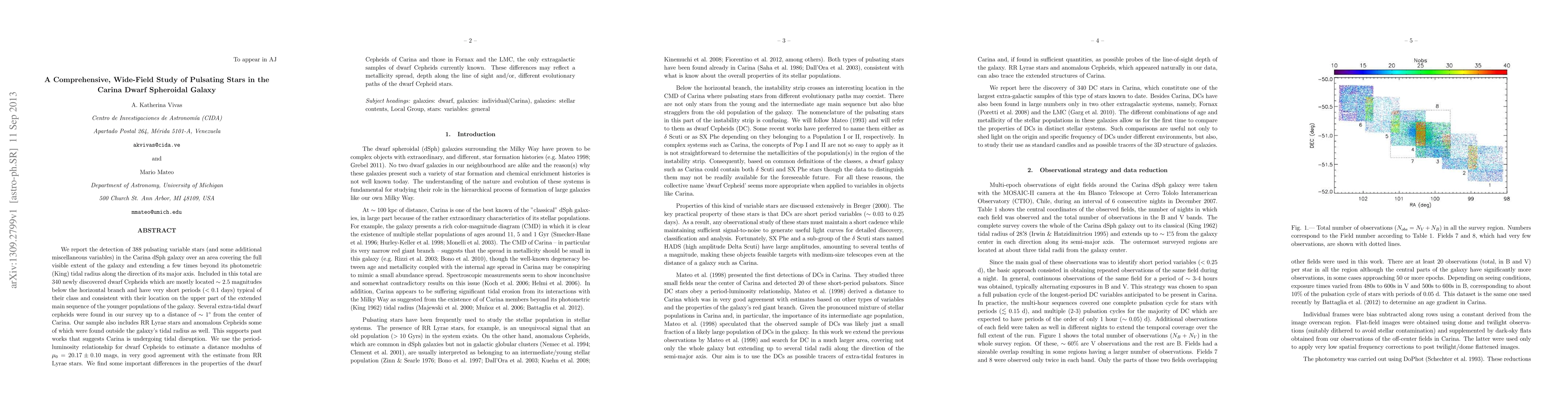 This study identifies 388 pulsating variable stars in the Carina Dwarf Spheroidal Galaxy, including 340 newly discovered dwarf Cepheids, and supports ongoing tidal disruption. The period-luminosity relationship confirms a distance modulus of 20.17 +/- 0.10 mags, aligning with RR Lyrae stars, and reveals differences in dwarf Cepheid properties compared to other galaxies.
