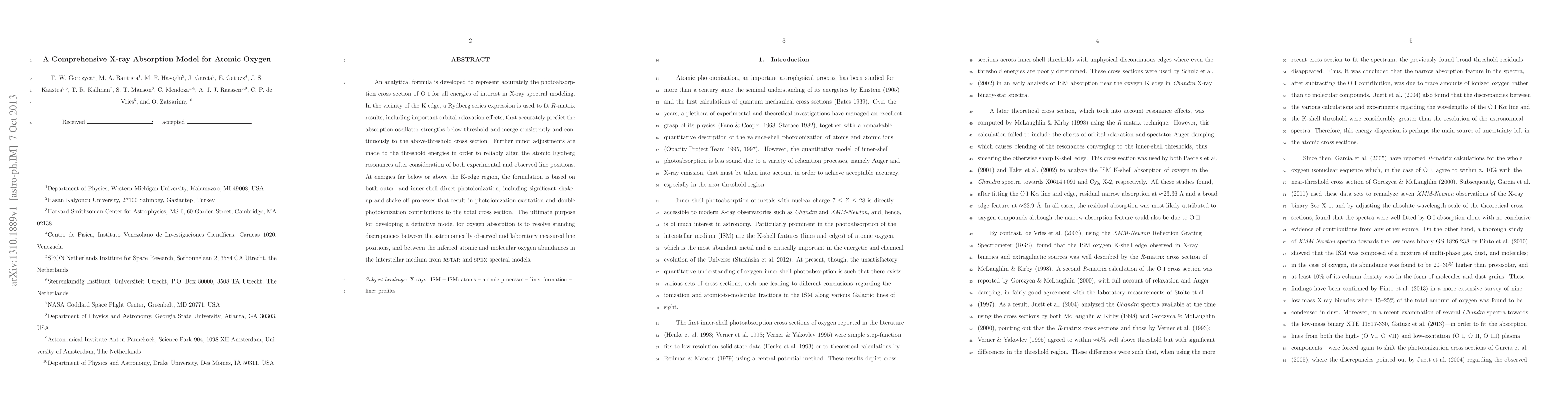 An analytical formula is developed to represent accurately the photoabsorption cross section of O I for all energies of interest in X-ray spectral modeling. In the vicinity of the Kedge, a Rydberg series expression is used to fit R-matrix results, including important orbital relaxation effects, that accurately predict the absorption oscillator strengths below threshold and merge consistently and continuously to the above-threshold cross section. Further minor adjustments are made to the threshold energies in order to reliably align the atomic Rydberg resonances after consideration of both experimental and observed line positions. At energies far below or above the K-edge region, the formulation is based on both outer- and inner-shell direct photoionization, including significant shake-up and shake-off processes that result in photoionization-excitation and double photoionization contributions to the total cross section. The ultimate purpose for developing a definitive model for oxygen absorption is to resolve standing discrepancies between the astronomically observed and laboratory measured line positions, and between the inferred atomic and molecular oxygen abundances in the interstellar medium from XSTAR and SPEX spectral models.