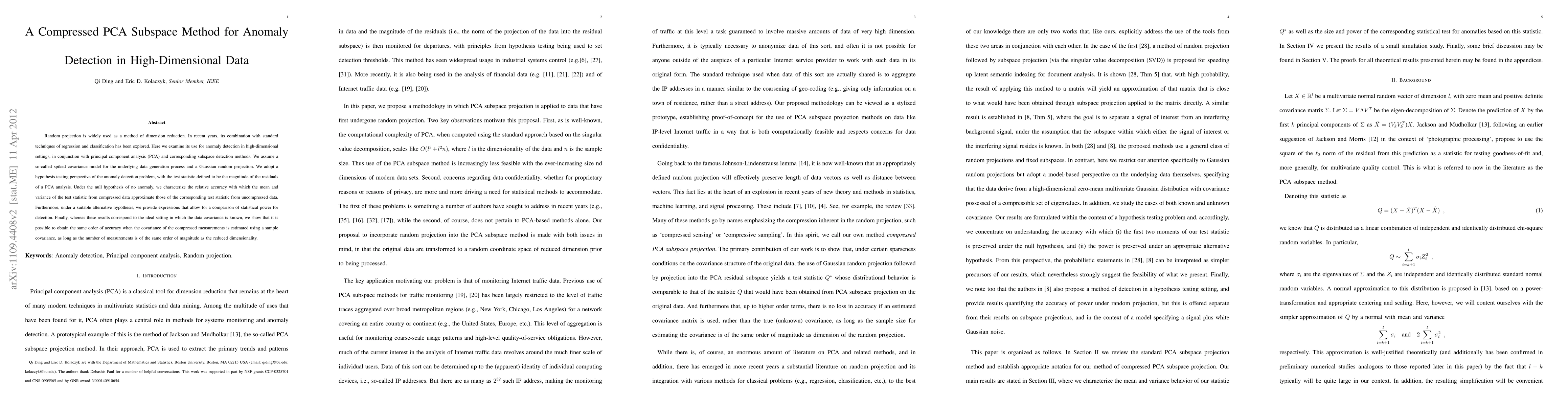 This paper proposes a compressed PCA method for anomaly detection in high-dimensional data, demonstrating that random projection combined with PCA can effectively reduce dimensionality while maintaining anomaly detection accuracy. The method is illustrated through its application to computer network traffic anomaly detection.