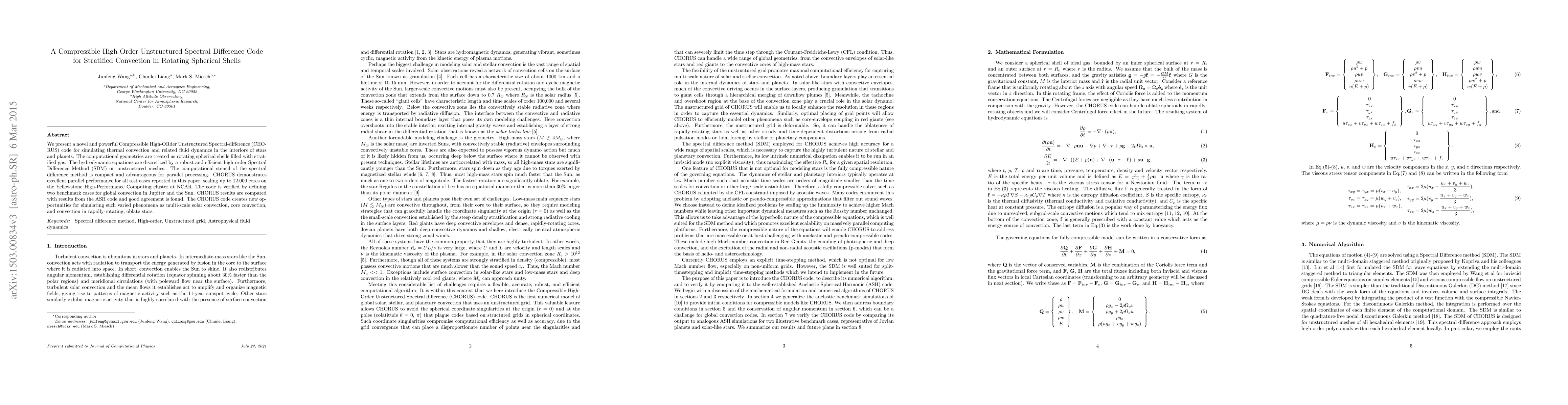 This paper introduces the CHORUS code, a high-order unstructured spectral-difference method for simulating stratified convection in rotating spherical shells, demonstrating excellent parallel performance and verified through benchmark cases for Jupiter and the Sun. The code opens new avenues for studying phenomena like solar and stellar convection.