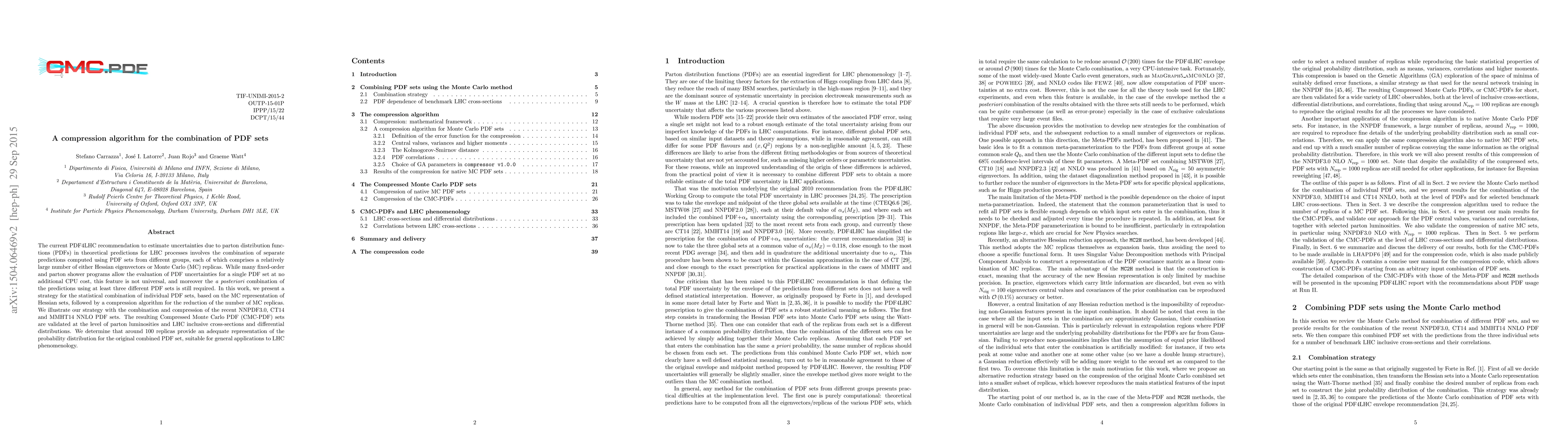 This paper introduces a compression algorithm to combine and reduce the size of multiple PDF sets for LHC processes, using the Compressed Monte Carlo PDF (CMC-PDF) approach. The CMC-PDF sets are validated against parton luminosities and LHC cross-sections, demonstrating that around 100 replicas suffice for accurate representation.