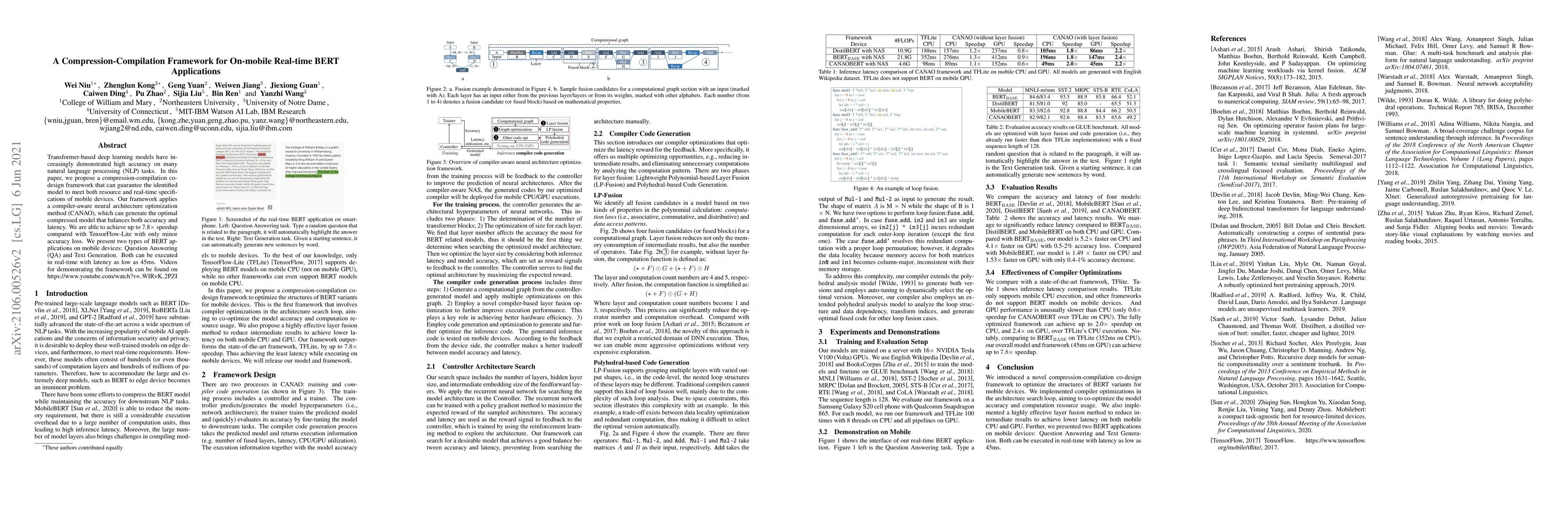 Transformer-based deep learning models have increasingly demonstrated high accuracy on many natural language processing (NLP) tasks. In this paper, we propose a compression-compilation co-design framework that can guarantee the identified model to meet both resource and real-time specifications of mobile devices. Our framework applies a compiler-aware neural architecture optimization method (CANAO), which can generate the optimal compressed model that balances both accuracy and latency. We are able to achieve up to 7.8x speedup compared with TensorFlow-Lite with only minor accuracy loss. We present two types of BERT applications on mobile devices: Question Answering (QA) and Text Generation. Both can be executed in real-time with latency as low as 45ms. Videos for demonstrating the framework can be found on https://www.youtube.com/watch?v=_WIRvK_2PZI