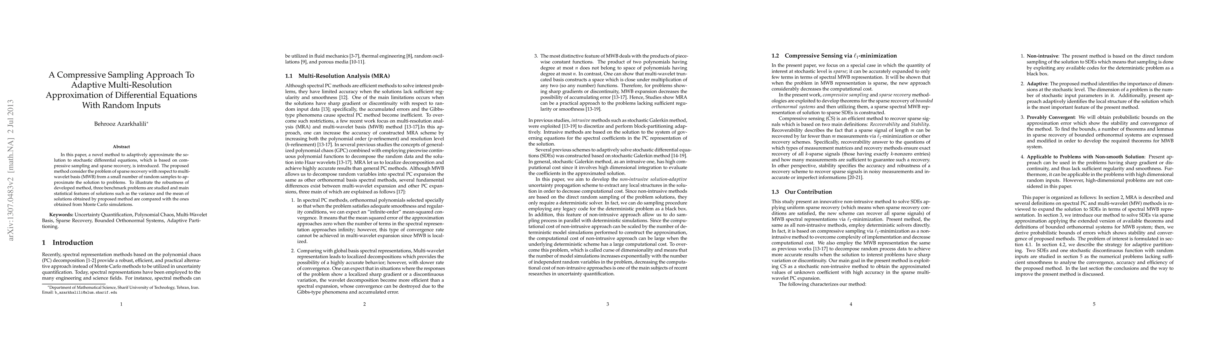 In this paper, a novel method to adaptively approximate the solution to stochastic differential equations, which is based on compressive sampling and sparse recovery, is introduced. The proposed method consider the problem of sparse recovery with respect to multi-wavelet basis (MWB) from a small number of random samples to approximate the solution to problems. To illustrate the robustness of developed method, three benchmark problems are studied and main statistical features of solutions such as the variance and the mean of solutions obtained by proposed method are compared with the ones obtained from Monte Carlo simulations.