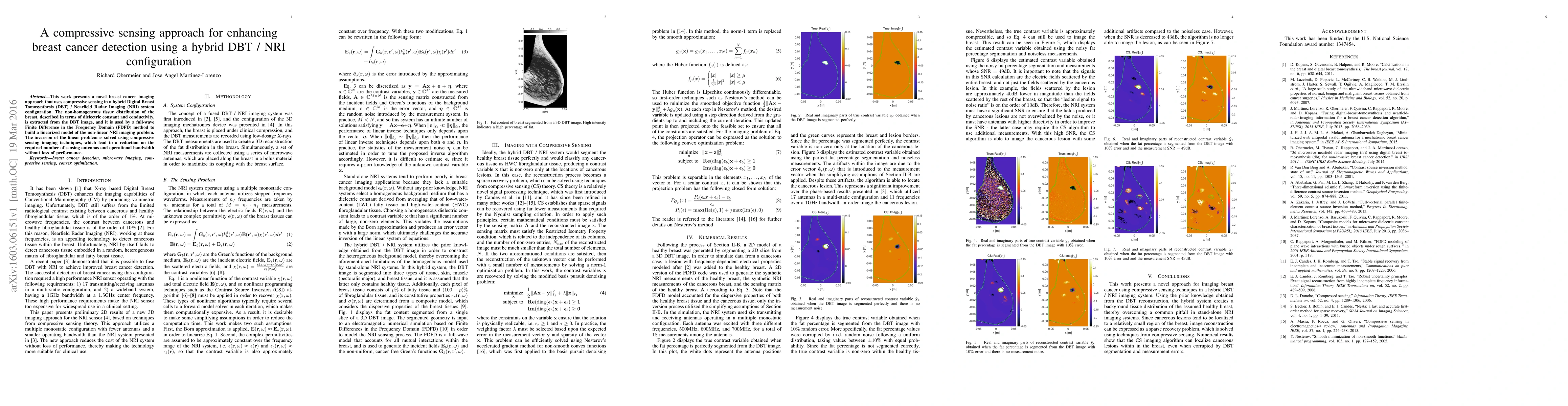 This work presents a novel breast cancer imaging approach that uses compressive sensing in a hybrid Digital Breast Tomosynthesis (DBT) / Nearfield Radar Imaging (NRI) system configuration. The non-homogeneous tissue distribution of the breast, described in terms of dielectric constant and conductivity, is extracted from the DBT image, and it is used by a full-wave Finite Difference in the Frequency Domain (FDFD) method to build a linearized model of the non-linear NRI imaging problem. The inversion of the linear problem is solved using compressive sensing imaging techniques, which lead to a reduction on the required number of sensing antennas and operational bandwidth without loss of performance.