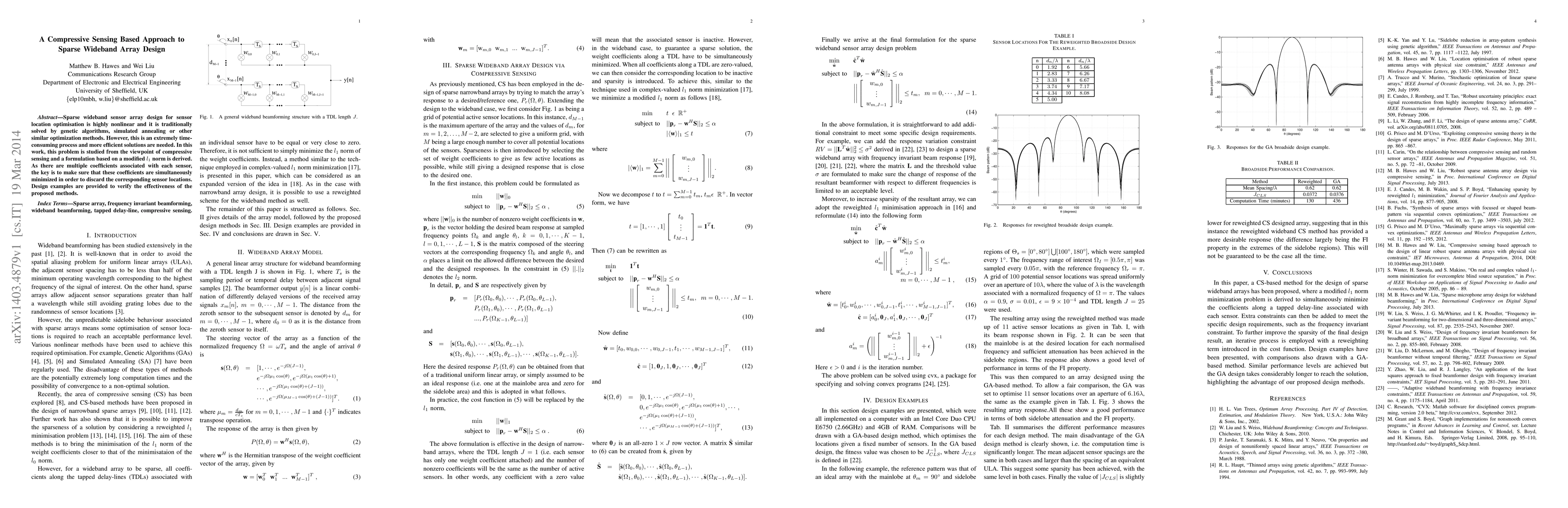 Sparse wideband sensor array design for sensor location optimisation is highly nonlinear and it is traditionally solved by genetic algorithms, simulated annealing or other similar optimization methods. However, this is an extremely time-consuming process and more efficient solutions are needed. In this work, this problem is studied from the viewpoint of compressive sensing and a formulation based on a modified $l_1$ norm is derived. As there are multiple coefficients associated with each sensor, the key is to make sure that these coefficients are simultaneously minimized in order to discard the corresponding sensor locations. Design examples are provided to verify the effectiveness of the proposed methods.