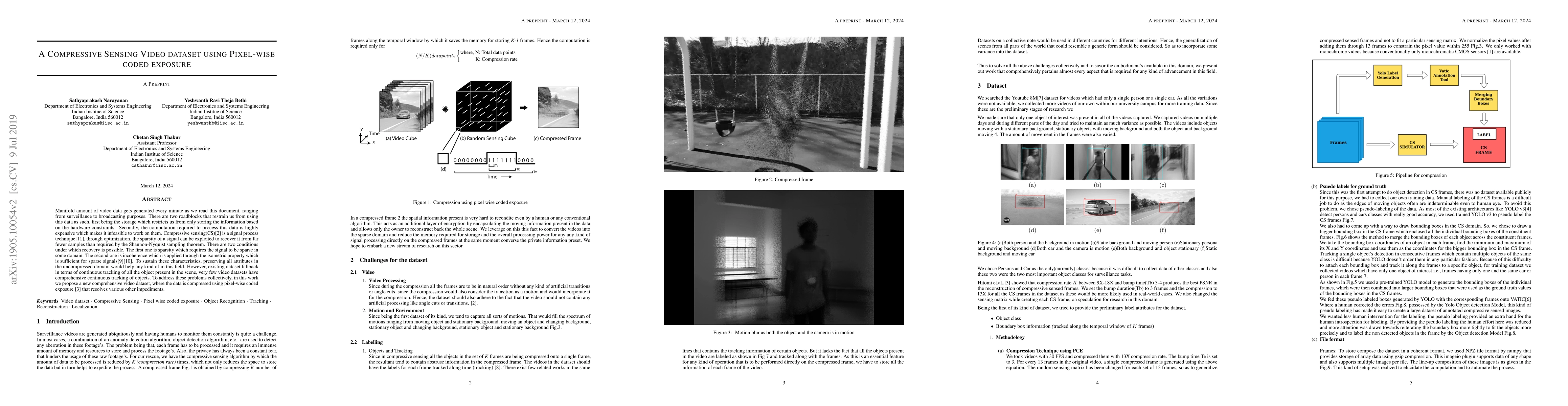 Manifold amount of video data gets generated every minute as we read this document, ranging from surveillance to broadcasting purposes. There are two roadblocks that restrain us from using this data as such, first being the storage which restricts us from only storing the information based on the hardware constraints. Secondly, the computation required to process this data is highly expensive which makes it infeasible to work on them. Compressive sensing(CS)[2] is a signal process technique[11], through optimization, the sparsity of a signal can be exploited to recover it from far fewer samples than required by the Shannon-Nyquist sampling theorem. There are two conditions under which recovery is possible. The first one is sparsity which requires the signal to be sparse in some domain. The second one is incoherence which is applied through the isometric property which is sufficient for sparse signals[9][10]. To sustain these characteristics, preserving all attributes in the uncompressed domain would help any kind of in this field. However, existing dataset fallback in terms of continuous tracking of all the object present in the scene, very few video datasets have comprehensive continuous tracking of objects. To address these problems collectively, in this work we propose a new comprehensive video dataset, where the data is compressed using pixel-wise coded exposure [3] that resolves various other impediments.