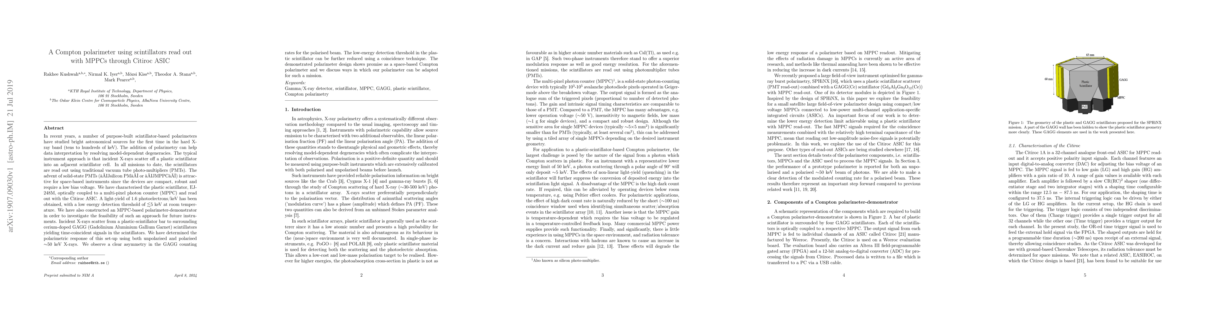 In recent years, a number of purpose-built scintillator-based polarimeters have studied bright astronomical sources for the first time in the hard X-ray band (tens to hundreds of keV). The addition of polarimetry can help data interpretation by resolving model-dependent degeneracies. The typical instrument approach is that incident X-rays scatter off a plastic scintillator into an adjacent scintillator cell. In all missions to date, the scintillators are read out using traditional vacuum tube photo-multipliers (PMTs). The advent of solid-state PMTs ("silicon PM" or "MPPC") is attractive for space-based instruments since the devices are compact, robust and require a low bias voltage. We have characterised the plastic scintillator, EJ-248M, optically coupled to a multi-pixel photon counter (MPPC) and read out with the Citiroc ASIC. A light-yield of 1.6 photoelectrons/keV has been obtained, with a low energy detection threshold of $\lesssim$5 keV at room temperature. We have also constructed an MPPC-based polarimeter-demonstrator in order to investigate the feasibility of such an approach for future instruments. Incident X-rays scatter from a plastic-scintillator bar to surrounding cerium-doped GAGG (Gadolinium Aluminium Gallium Garnet) scintillators yielding time-coincident signals in the scintillators. We have determined the polarimetric response of this set-up using both unpolarised and polarised $\sim$50 keV X-rays. We observe a clear asymmetry in the GAGG counting rates for the polarised beam. The low-energy detection threshold in the plastic scintillator can be further reduced using a coincidence technique. The demonstrated polarimeter design shows promise as a space-based Compton polarimeter and we discuss ways in which our polarimeter can be adapted for such a mission.