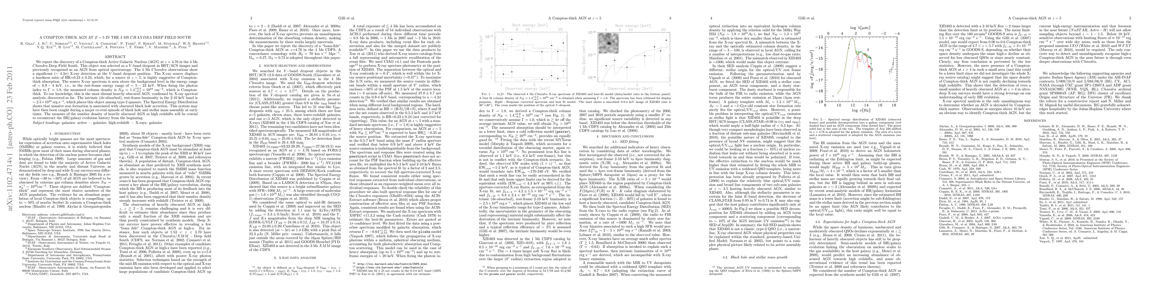 This paper reports the discovery of a Compton-thick Active Galactic Nucleus (AGN) at z=4.76 in the Chandra Deep Field South, confirmed by X-ray spectral analysis to have a column density indicative of Compton-thick absorption. The object is among the most distant heavily obscured AGNs, suggesting a major episode of black hole and stellar mass assembly in the early universe.