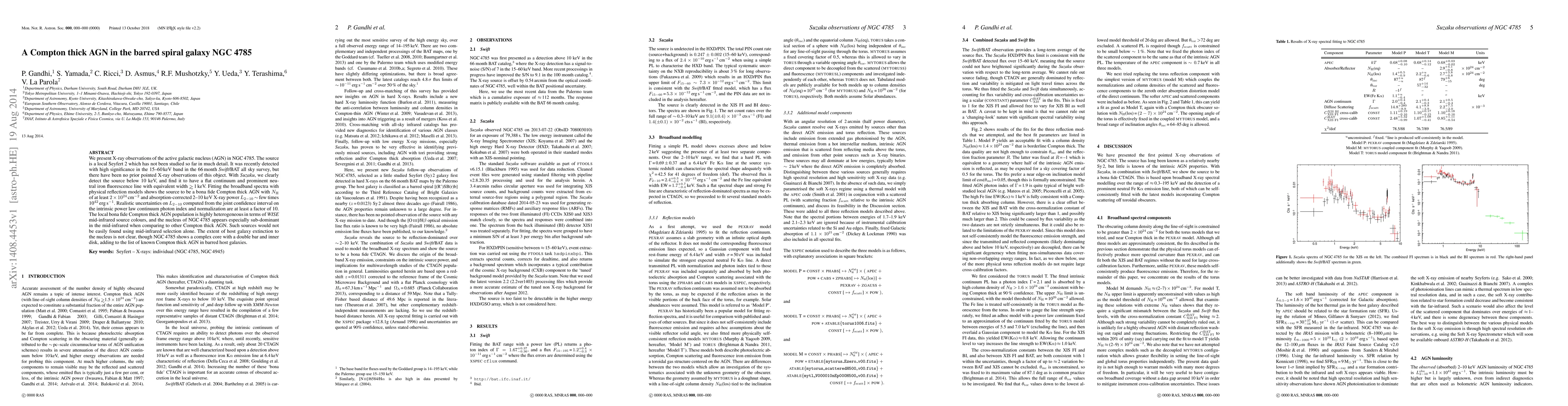 We present X-ray observations of the active galactic nucleus (AGN) in NGC 4785. The source is a local Seyfert 2 which has not been studied so far in much detail. It was recently detected with high significance in the 15-60 keV band in the 66 month Swift/BAT all sky survey, but there have been no prior pointed X-ray observations of this object. With Suzaku, we clearly detect the source below 10 keV, and find it to have a flat continuum and prominent neutral iron fluorescence line with equivalent width >~1 keV. Fitting the broadband spectra with physical reflection models shows the source to be a bona fide Compton thick AGN with Nh of at least 2x10^{24} cm^{-2} and absorption-corrected 2-10 keV X-ray power L(2-10) ~ few times 10^{42} erg s^{-1}. Realistic uncertainties on L(2-10) computed from the joint confidence interval on the intrinsic power law continuum photon index and normalization are at least a factor of 10. The local bona fide Compton thick AGN population is highly heterogeneous in terms of WISE mid-infrared source colours, and the nucleus of NGC 4785 appears especially sub-dominant in the mid-infrared when comparing to other Compton thick AGN. Such sources would not be easily found using mid-infrared selection alone. The extent of host galaxy extinction to the nucleus is not clear, though NGC 4785 shows a complex core with a double bar and inner disk, adding to the list of known Compton thick AGN in barred host galaxies.