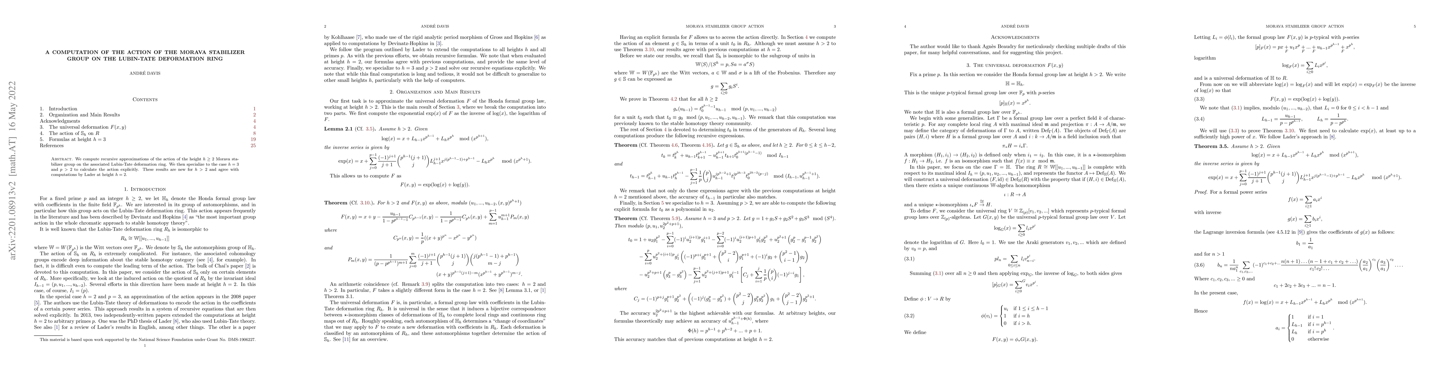 This paper computes the action of the Morava stabilizer group on the Lubin-Tate deformation ring through recursive approximations, with a special focus on height $h=3$ and prime $p>2$. The results are novel for $h>2$ and align with previous findings at height $h=2$.