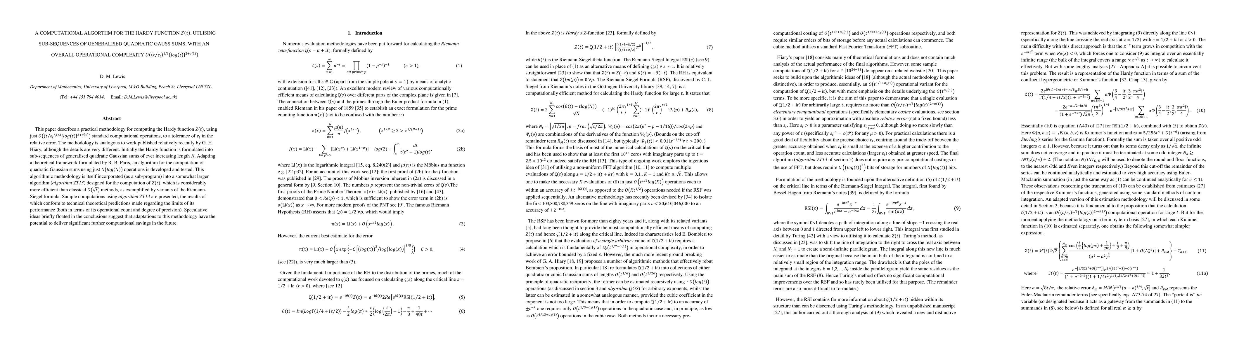 This paper describes a practical methodology for computing the Hardy function Z(t), using just O(((t/epsilon)^(1/3))*(log(t))^(2+o(1)))) standard computational operations, to a tolerance of epsilon in the relative error. The methodology is analogous to work published relatively recently by G. H. Hiary, although the details are very different. Initially the Hardy function is formulated into sub-sequences of generalised quadratic Gaussian sums of ever increasing length N. Adapting a theoretical framework formulated by R. B. Paris, an algorithm for the computation of quadratic Gaussian sums using just O(log(N)) operations is developed and tested. This algorithmic methodology is itself incorporated (as a sub-program) into a somewhat larger algorithm (algorithm ZT13) designed for the computation of Z(t), which is considerably more efficient than classical O(sqrt(t)) methods, as exemplified by variants of the Riemann-Siegel formula. Sample computations using algorithm ZT13 are presented, the results of which conform to technical theoretical predictions made regarding the limits of its performance (both in terms of its operational count and degree of precision). Speculative ideas briefly floated in the conclusions suggest that adaptations to this methodology have the potential to deliver significant further computational savings in the future.