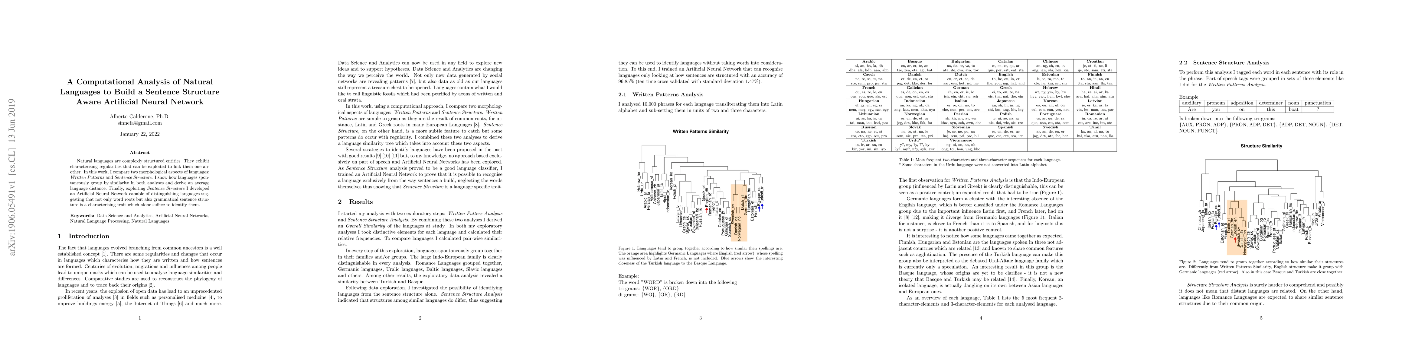 This research compares written patterns and sentence structure in natural languages to identify inherent similarities, developing an Artificial Neural Network that uses sentence structure to distinguish languages, indicating that grammatical structure is a significant identifying trait.