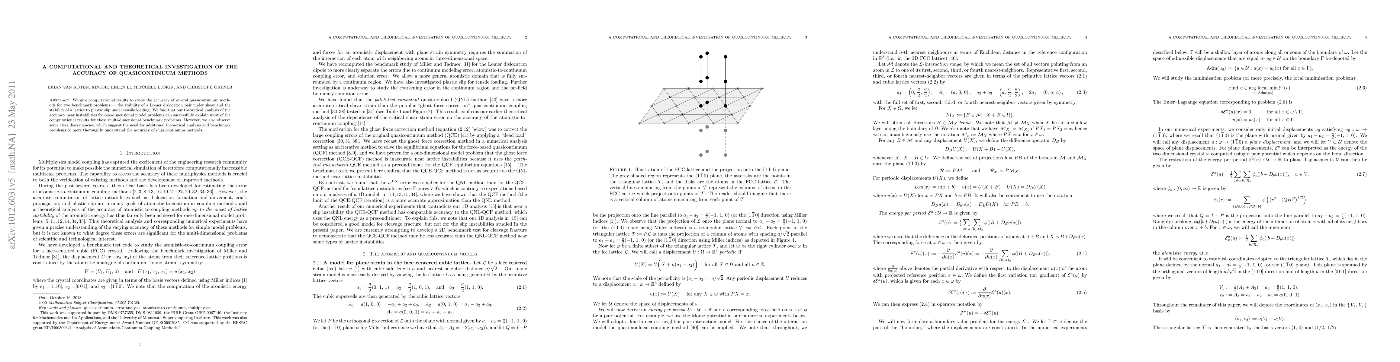 We give computational results to study the accuracy of several quasicontinuum methods for two benchmark problems - the stability of a Lomer dislocation pair under shear and the stability of a lattice to plastic slip under tensile loading. We find that our theoretical analysis of the accuracy near instabilities for one-dimensional model problems can successfully explain most of the computational results for these multi-dimensional benchmark problems. However, we also observe some clear discrepancies, which suggest the need for additional theoretical analysis and benchmark problems to more thoroughly understand the accuracy of quasicontinuum methods.