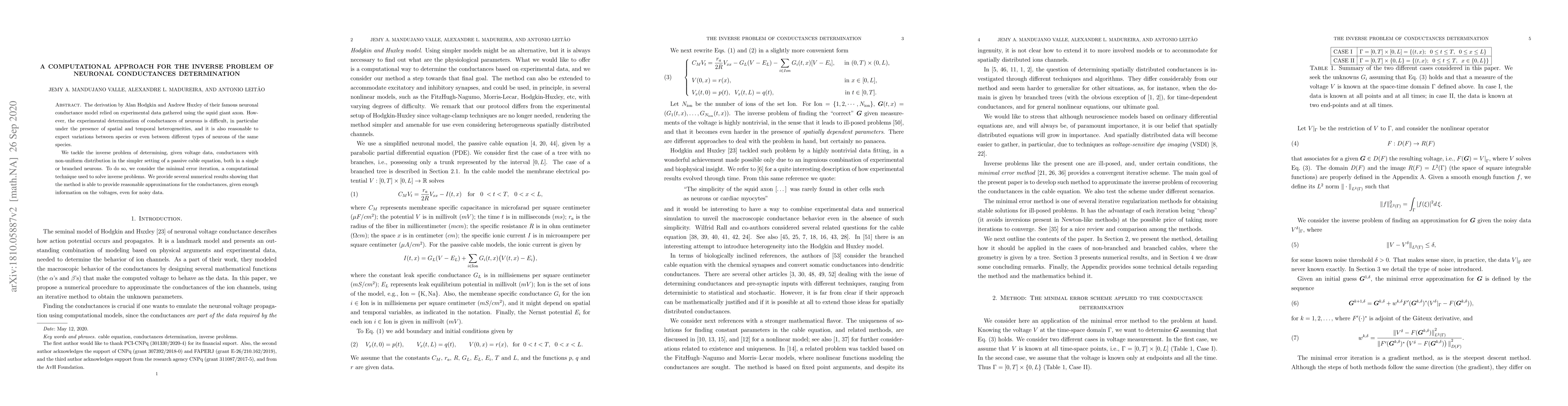 The derivation by Alan Hodgkin and Andrew Huxley of their famous neuronal conductance model relied on experimental data gathered using neurons of the giant squid. It becomes clear that determining experimentally the conductances of neurons is hard, in particular under the presence of spatial and temporal heterogeneities. Moreover it is reasonable to expect variations between species or even between types of neurons of a same species. Determining conductances from one type of neuron is no guarantee that it works across the board. We tackle the inverse problem of determining, given voltage data, conductances with non-uniform distribution computationally. In the simpler setting of a cable equation, we consider the Landweber iteration, a computational technique used to identify non-uniform spatial and temporal ionic distributions, both in a single branch or in a tree. Here, we propose and (numerically) investigate an iterative scheme that consists in numerically solving two partial differential equations in each step. We provide several numerical results showing that the method is able to capture the correct conductances given information on the voltages, even for noisy data.