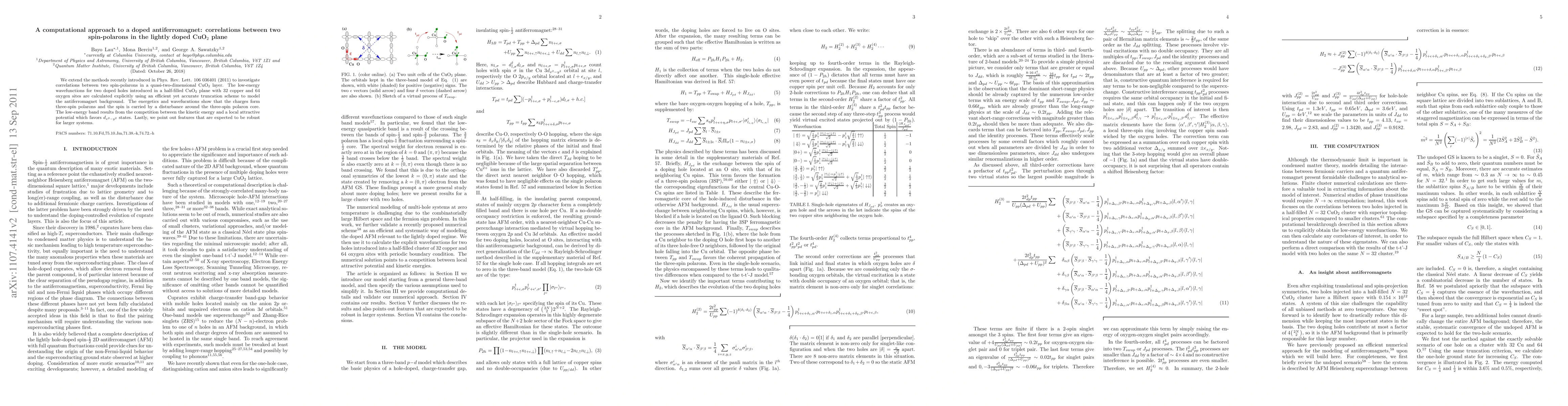 The paper presents a computational study on correlations between two spin-polarons in a lightly doped CuO2 plane. It uses an efficient truncation scheme to model the antiferromagnet background, revealing that charges form three-spin polarons and spins are carried by disturbances around these cores. The findings suggest that the low-energy band results from kinetic energy and an attractive potential favoring d(x^2-y^2) states, with certain features expected to hold for larger systems.