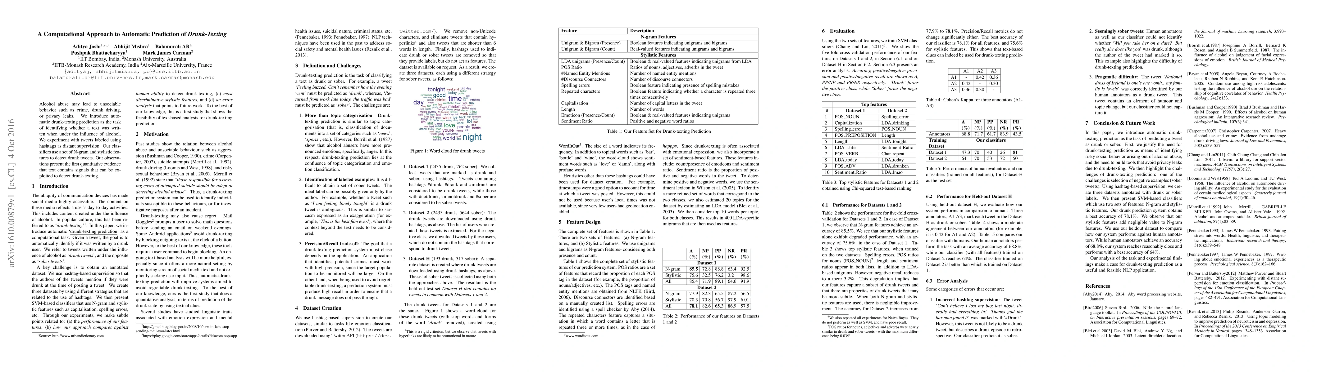 This research proposes a computational method to automatically predict drunk texting by analyzing text features and N-grams. The study uses tweets labeled with hashtags for distant supervision and finds that text contains identifiable signals for detecting drunk-texting, providing initial quantitative evidence for this approach.